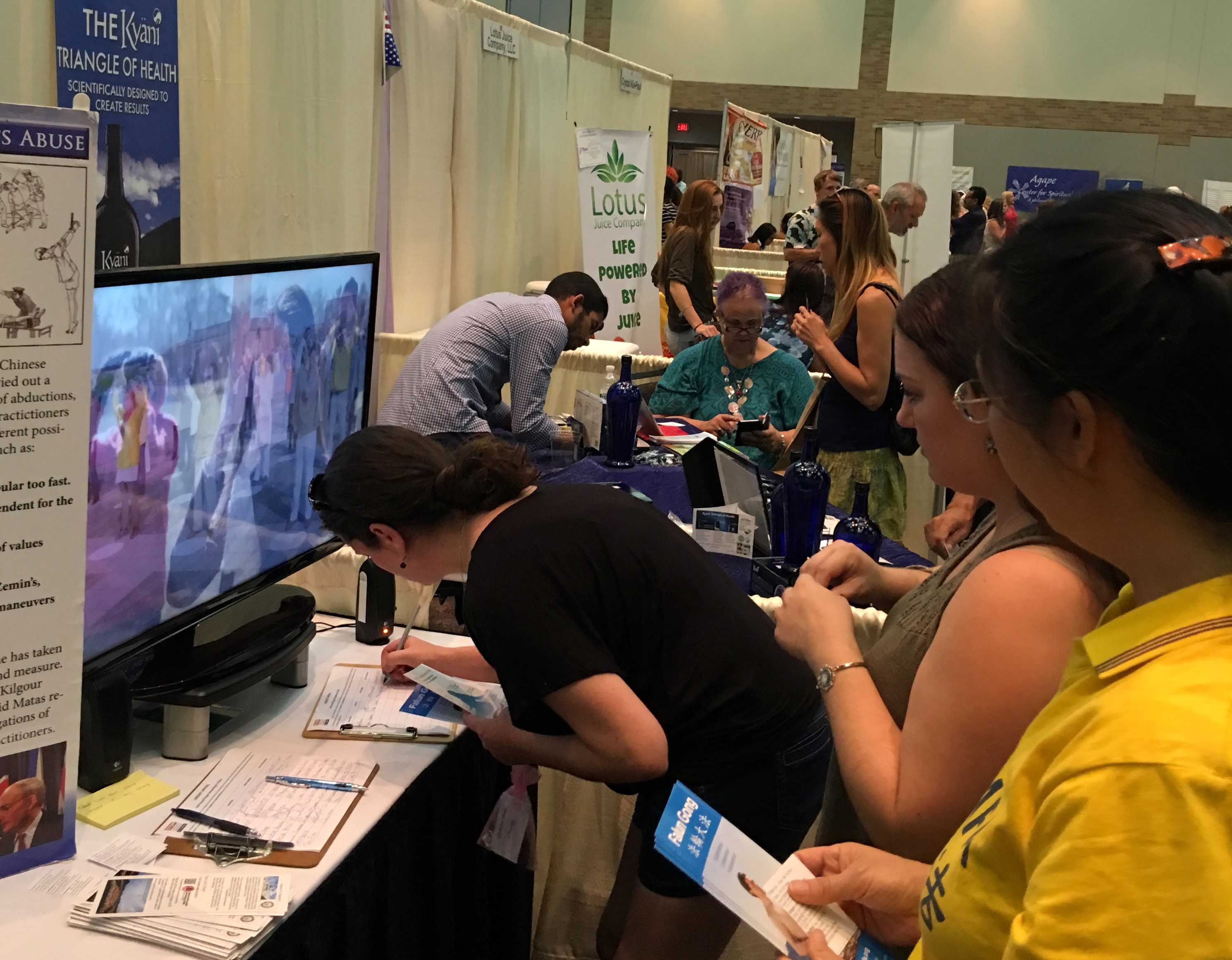 学员们还向人们讲述中共在中国大陆对法轮功的迫害,曝光中共活摘法轮功学员器官的罪恶,很多人都在征签表上郑重签下了自己的名字,要求中共立即停止此罪恶。