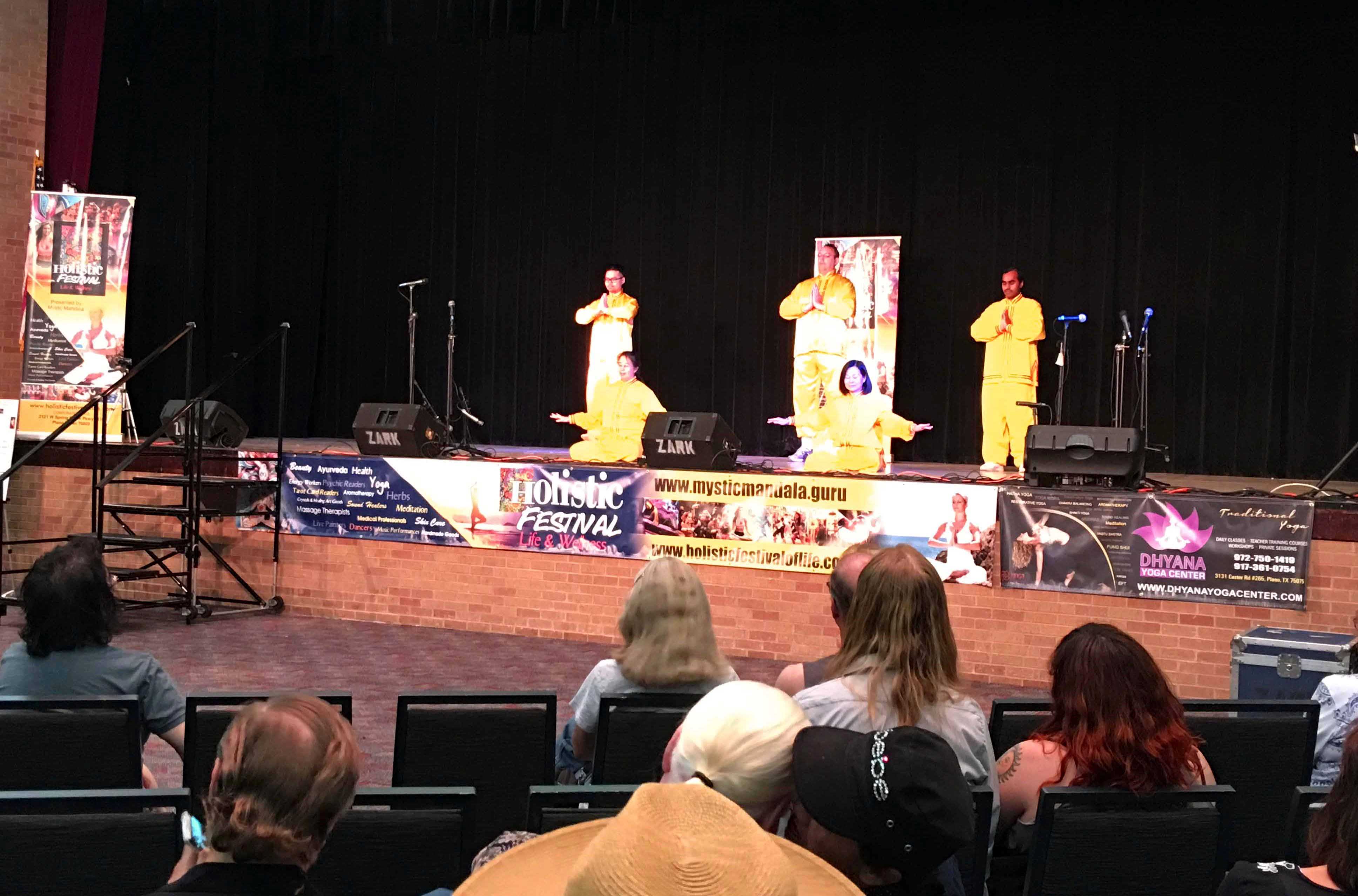 傍晚,几位法轮功学员在台上向人展示了功法。