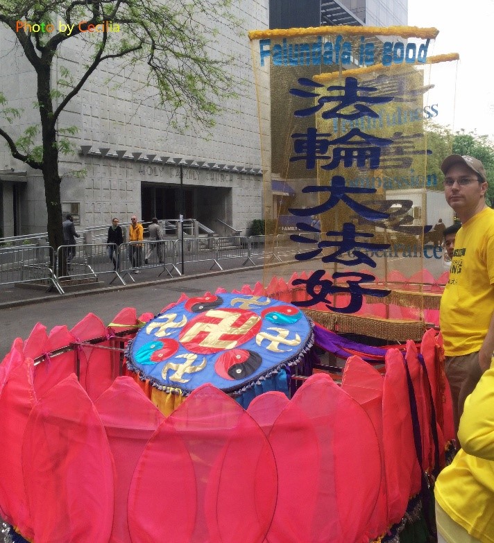 五月十三号一大早,我八点半就来到了联合国广场,当时广场上已经是热闹非凡了,有一大群人在广场前炼功,中间有很多人在为稍后的游行做最后的准备,还有很多人在聊天,其中不乏外国面孔。我四处游荡,感觉像是刘姥姥一进大观园,看哪儿都新鲜。