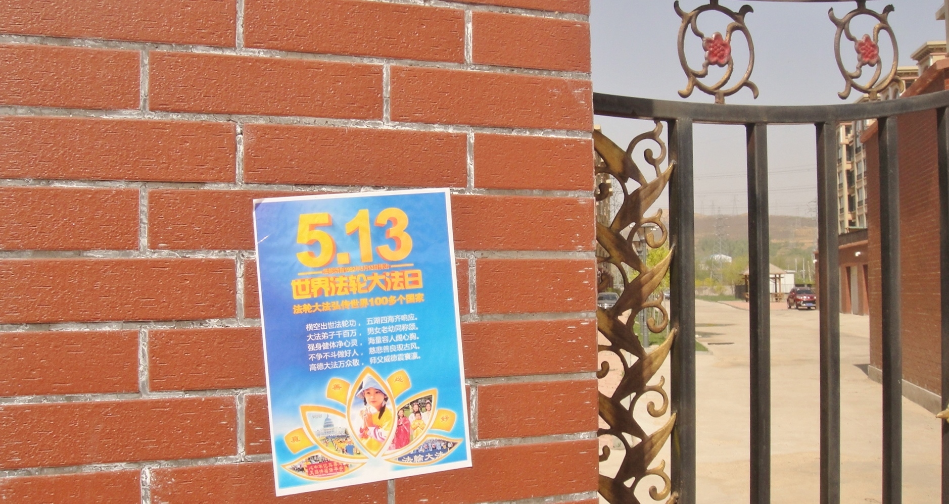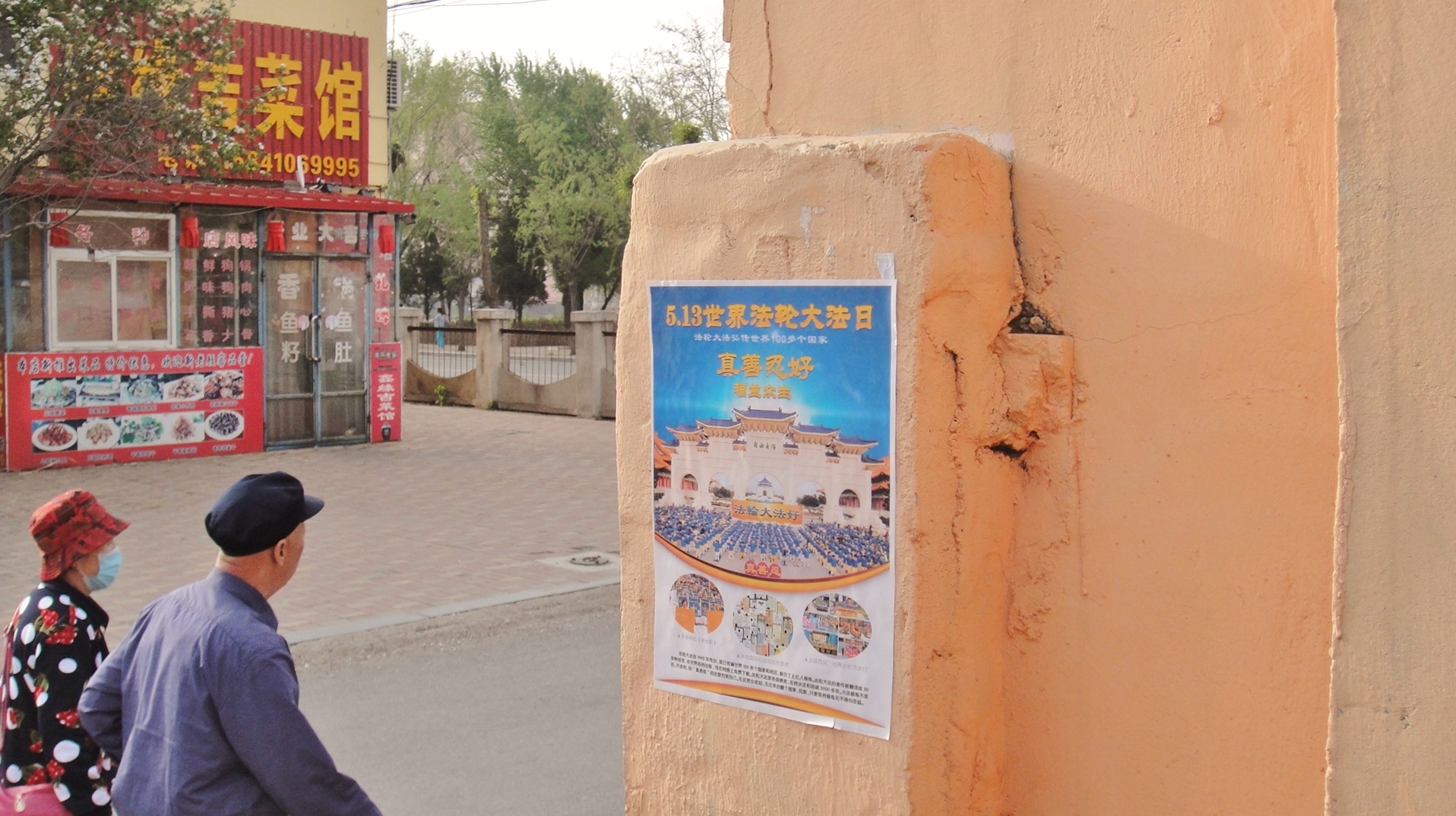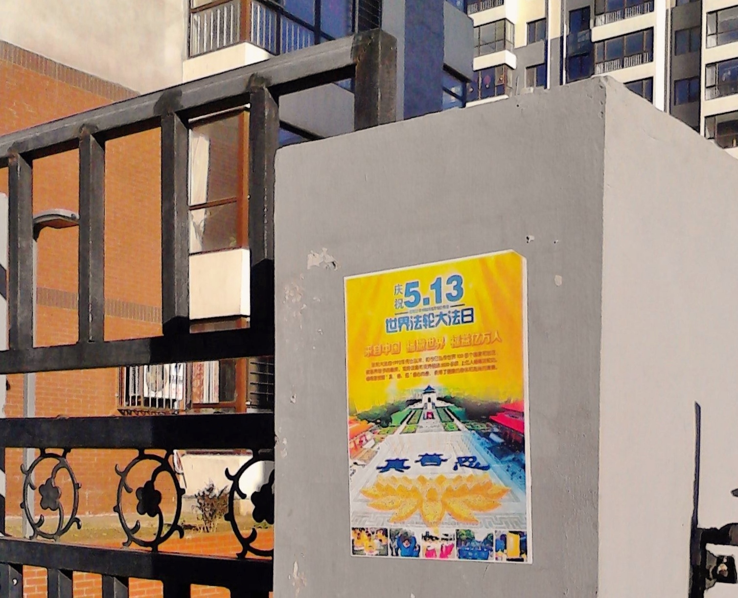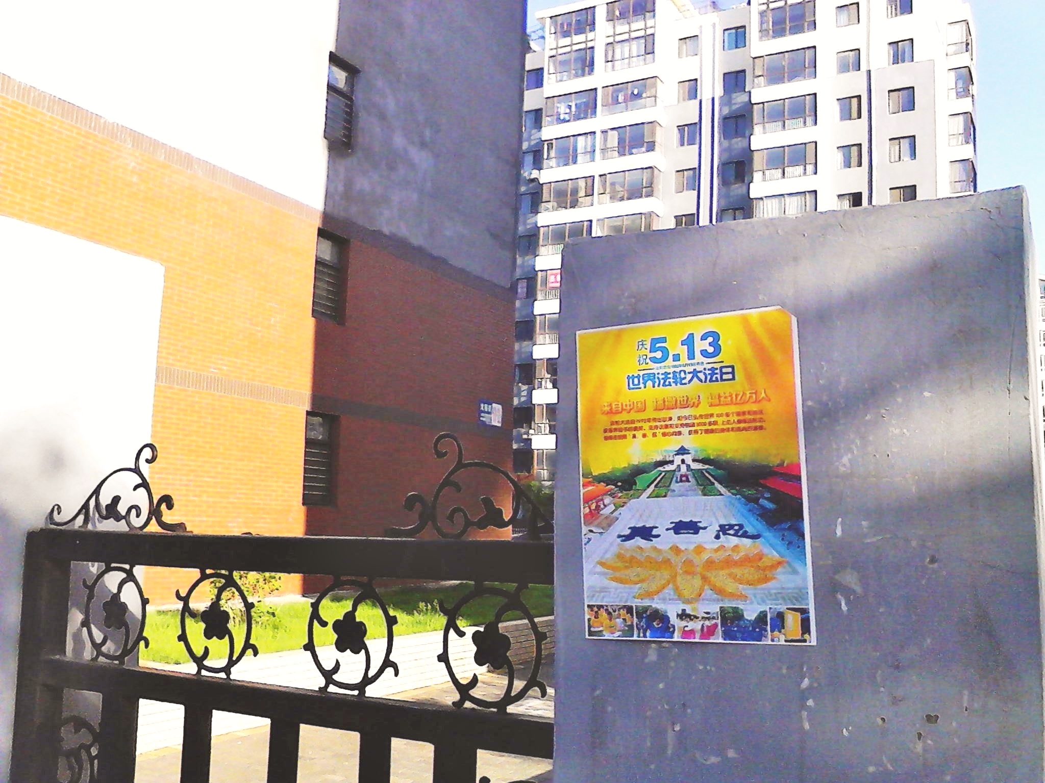 二零一六年五月十三日前后,在东北某地街道、家属区都可见到“法轮大法好”的条幅和粘贴。