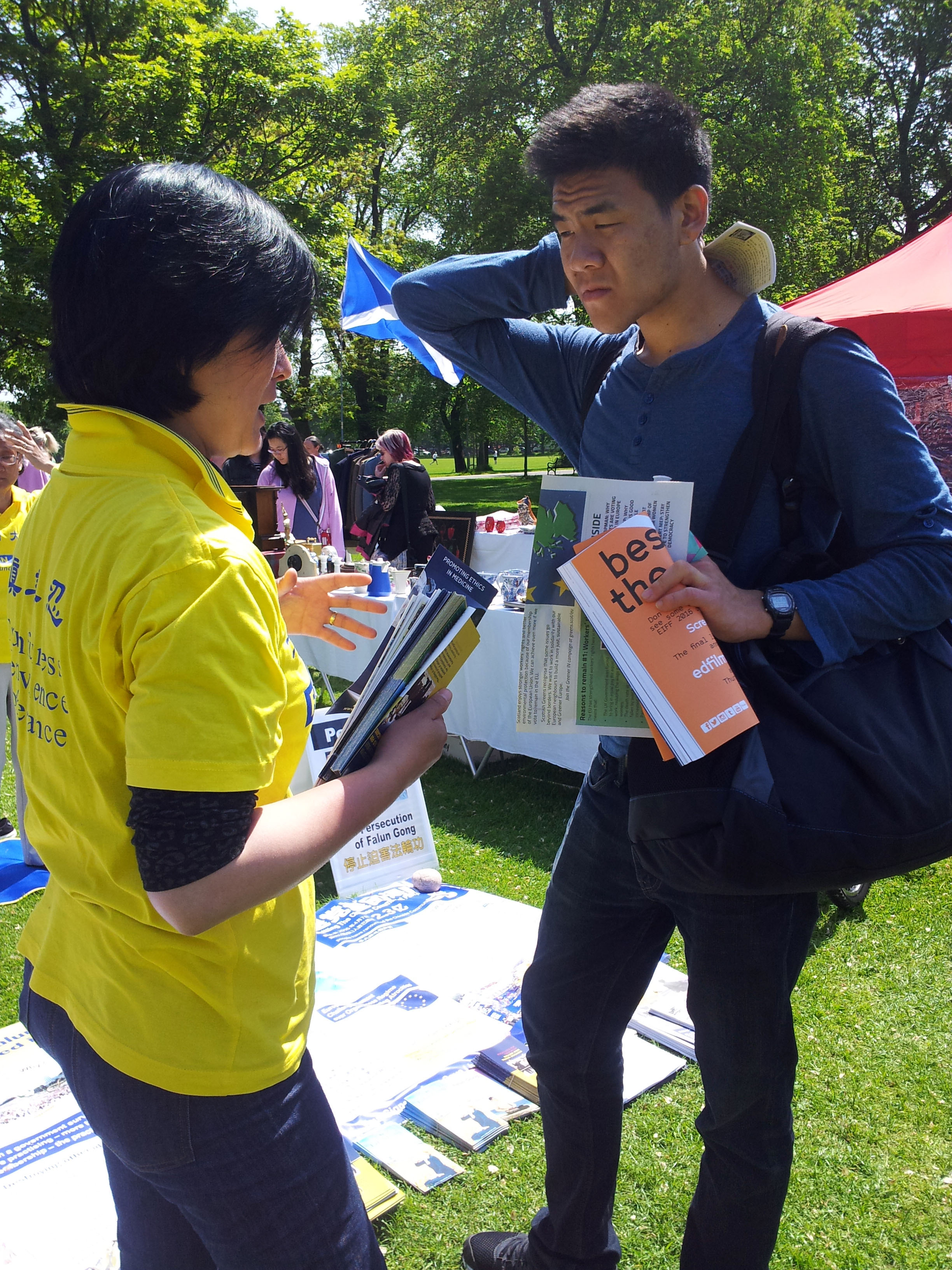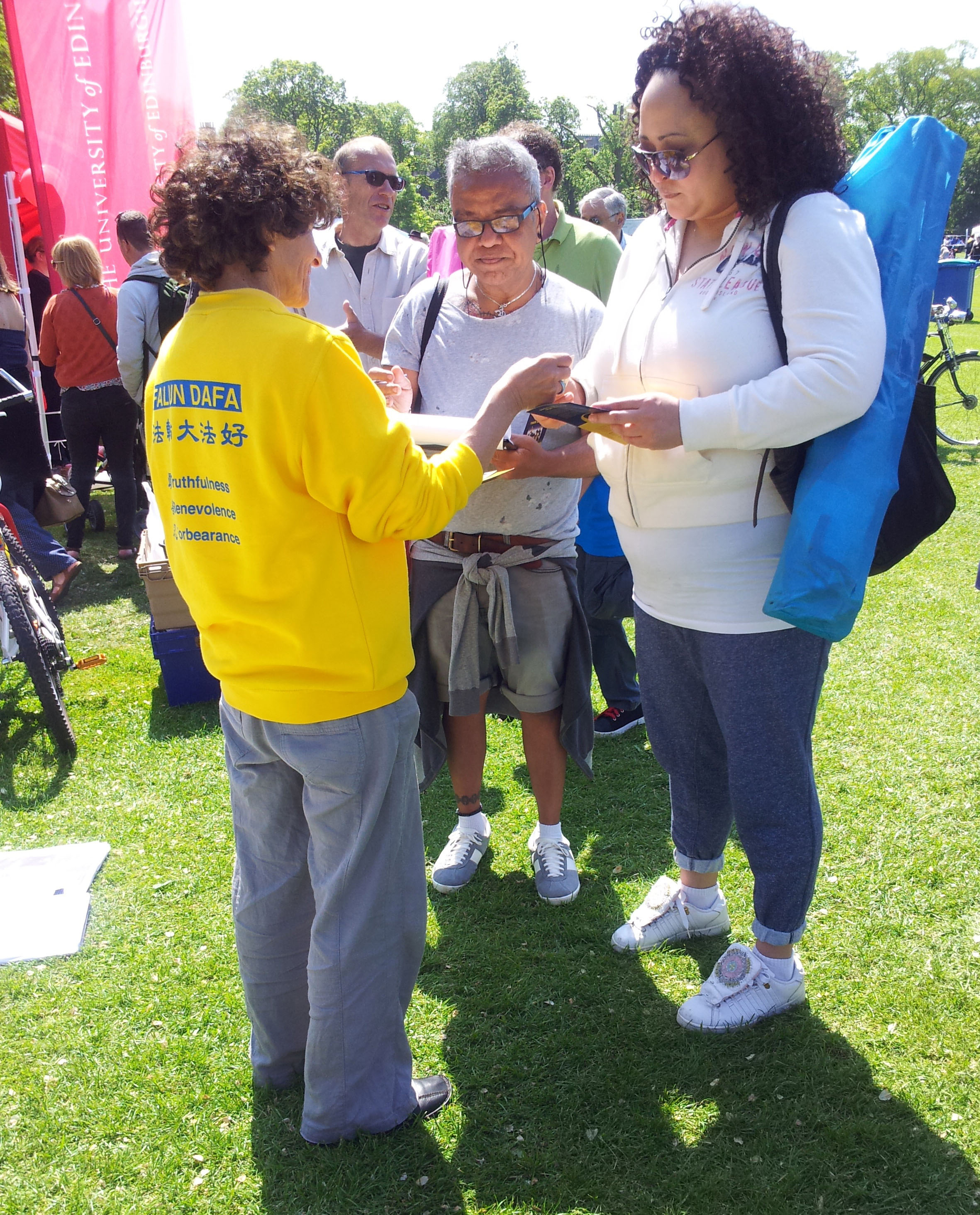 委内瑞拉来爱丁堡旅游的一位女士和一位男士,和法轮功学员交谈了很久,详细了解了什么是法轮功,中共为什么要迫害,活摘器官是怎么被揭露出来的……整个过程中他们一再说这太让人震惊了,这样的罪恶一定要制止。