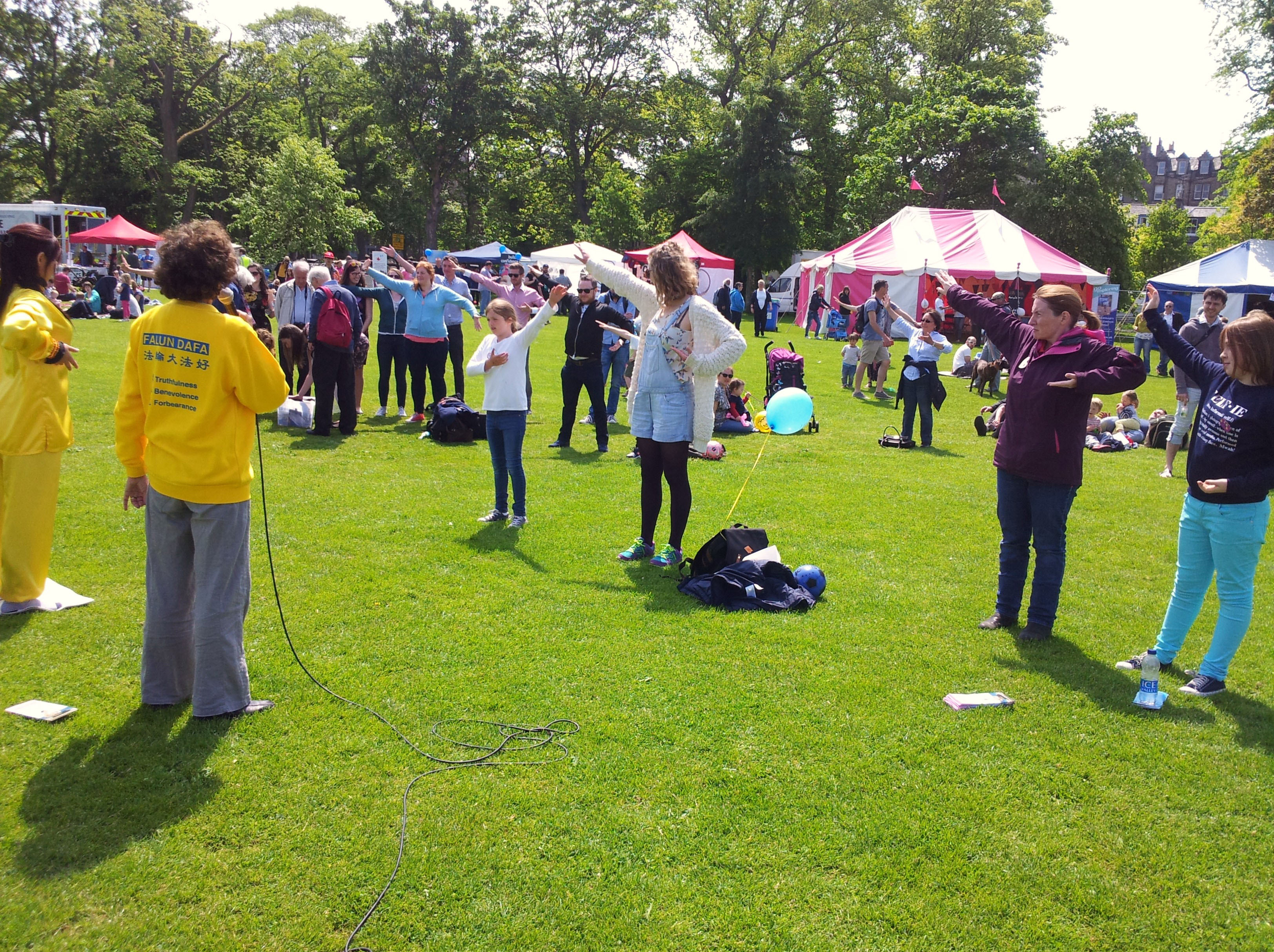 ![]() 法轮功学员在爱丁堡草地音乐节上现场教功 |