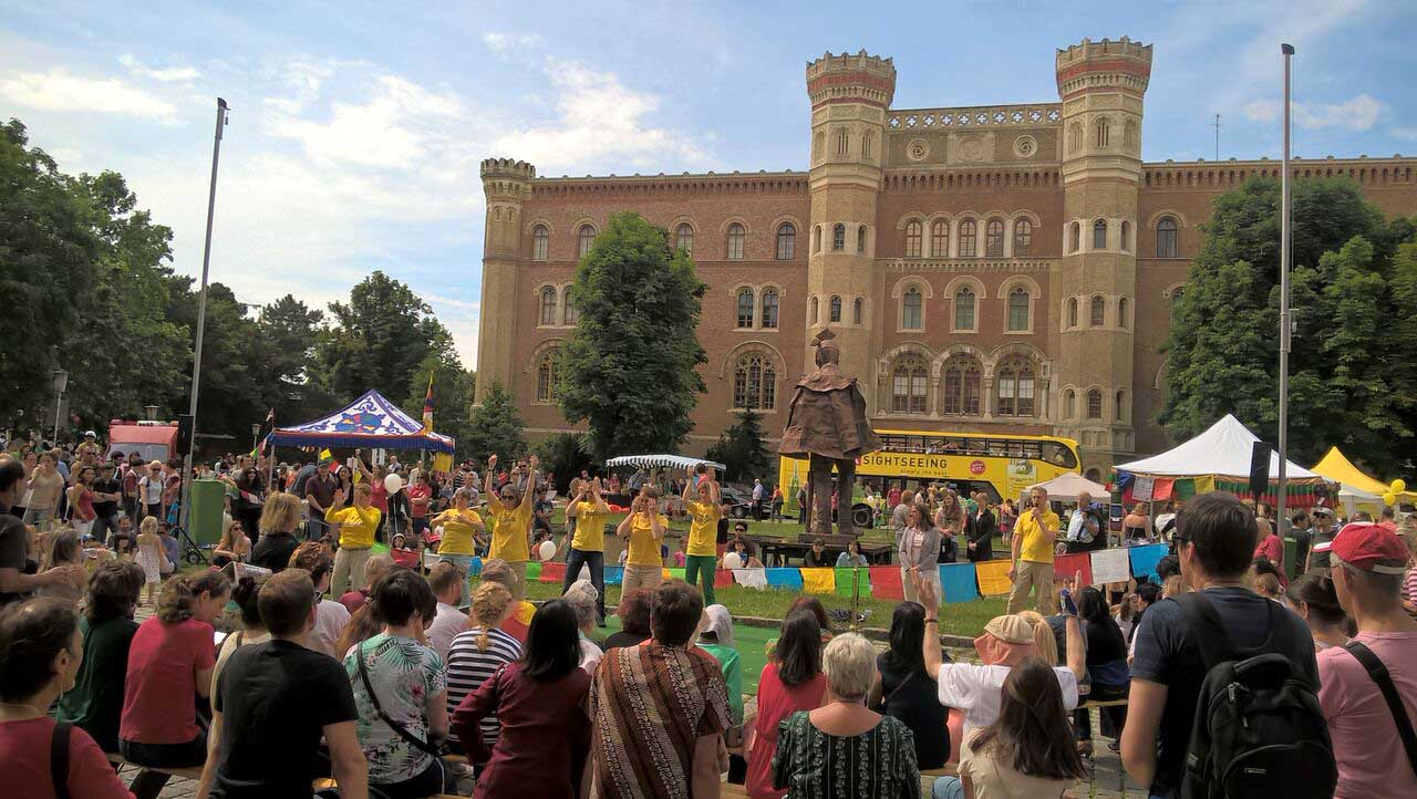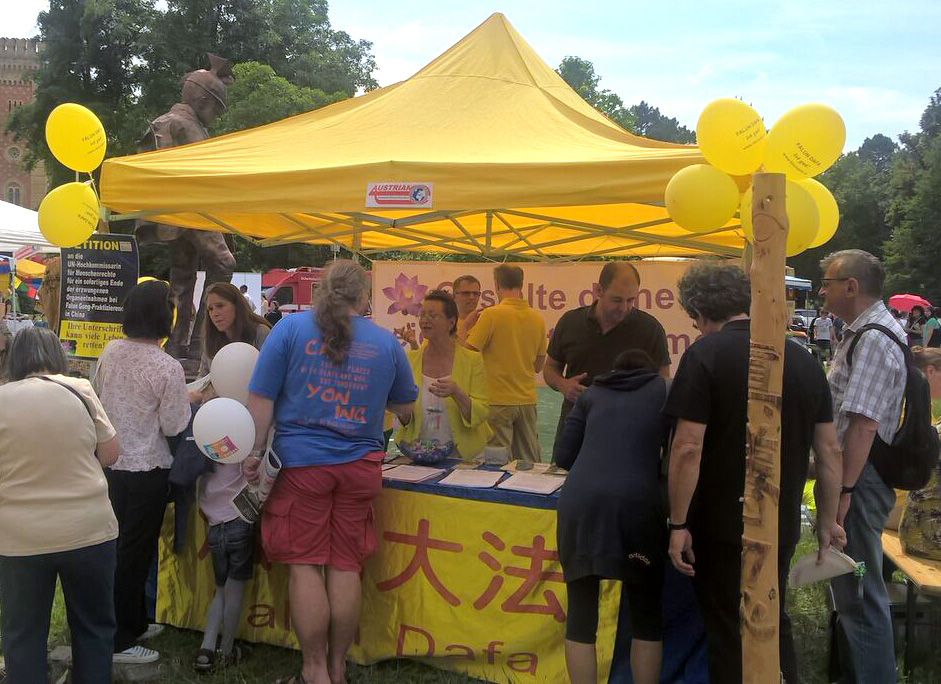 六月十九日,法轮功学员再次被邀请参加了维也纳民族文化节的活动。本次活动和往年一样,在维也纳军事博物馆花园举行。活动邀请奥地利的各族裔舞蹈团体和音乐团体表演。法轮功学员也被邀请在现场做功法演示。法轮功学员在介绍功法的同时,向前来参加文化节的各界民众讲述了中共活体摘取法轮功学员器官牟取暴利、及残酷迫害法轮功学员的暴行。