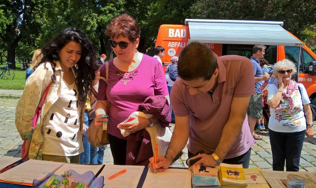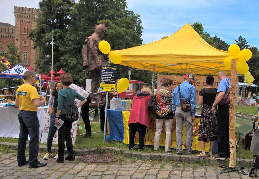 一位在奥地利长大的中国年轻人,来到法轮功学员信息台前,想知道为什么这么祥和的功法在中国被禁止和迫害。当学员给他讲解了法轮功被迫害的真相后,他在制止活摘法轮功学员器官的征签表上签名,并索取了中文的真相传单,要带回家给他的父母看。