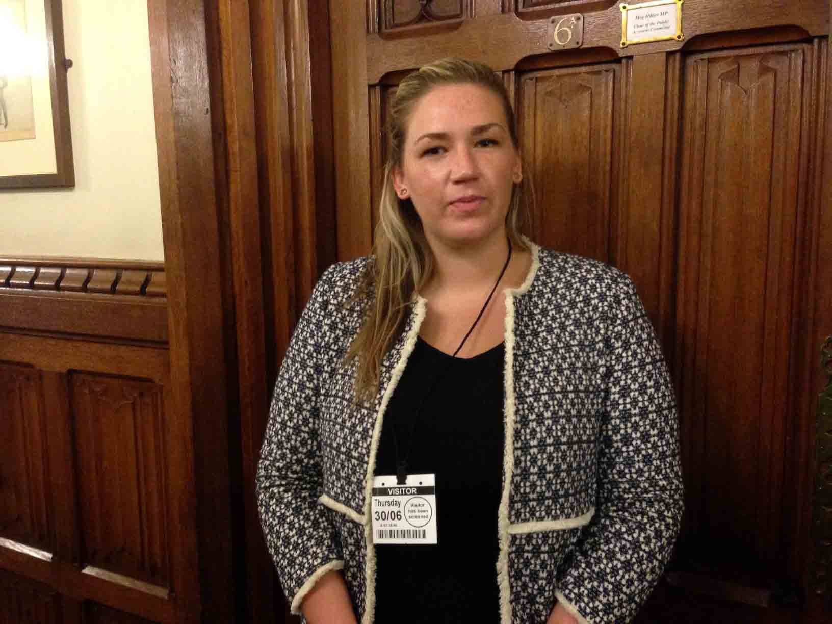 苏格兰女士劳伦•维德勒(Lauren Vidler)在非政府组织“人权无疆界国际组织”(Human Rights Without Frontiers International )工作,六月三十日在国会大厦出席了中共强摘法轮功学员等良心犯器官听证会。听证会头一天晚上她在英国上议会介绍《宗教或信仰自由2015年世界年度报告》(Freedom of Religion or Belief,World Annual Report 2015),在那里听到举办活摘听证会的消息后立即决定参加。