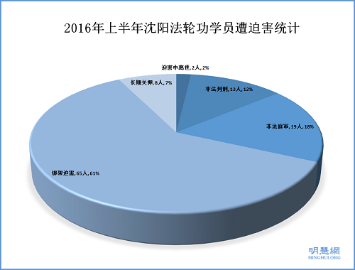 沈阳市法轮功学员二零一六年上半年受迫害情况,从地区上看主要发生在沈阳市皇姑区,从受迫害人数上看主要集中在六月份。仅六月二十八日,辽宁省沈阳市法轮功学员至少有二十三人被绑架,而另据明慧资料报道,同一天辽宁省就有高达一百多名法轮功学员被绑架,涉及地区涵盖沈阳、大连、鞍山、本溪、营口、朝阳、铁岭、锦州、海城等地,发生迫害原因主要是针对法轮功学员“诉江”,参与迫害的主要责任人幕后黑手是辽宁省“610”及各地610公安国保。