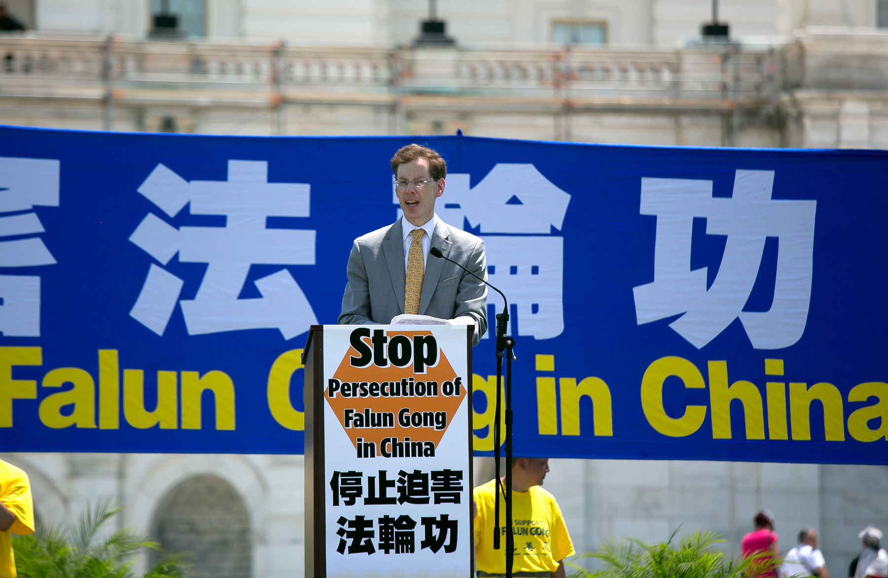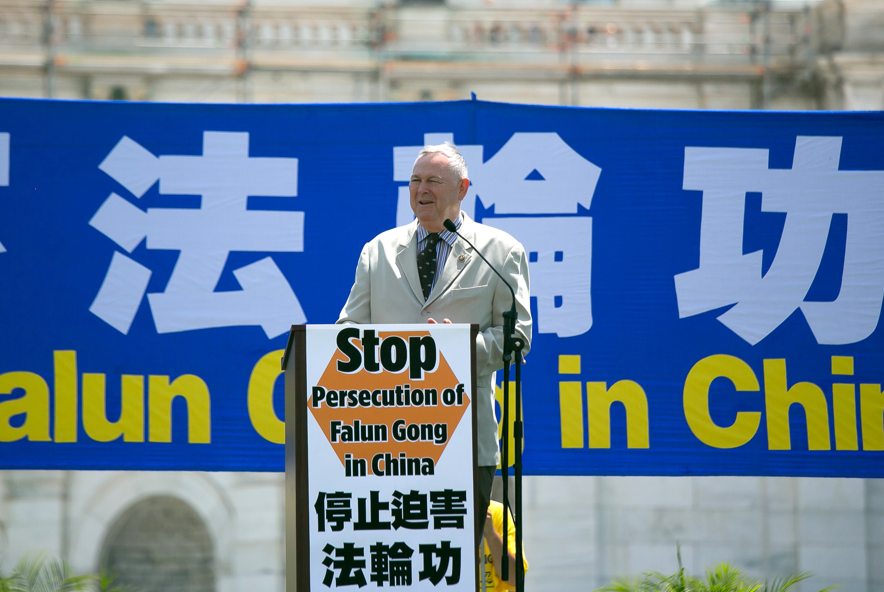 共和党资深众议员、众议院欧洲欧亚潜在威胁小组主席达纳·罗拉巴克(Dana Rohrabacher)在发言中向法轮功学员致谢,感谢法轮功学员及家人的勇气,他说:“法轮功学员在面对邪恶的最前线。你们站在对抗邪恶的最前线——这关系到我们所有的人,这邪恶威胁到全人类。”