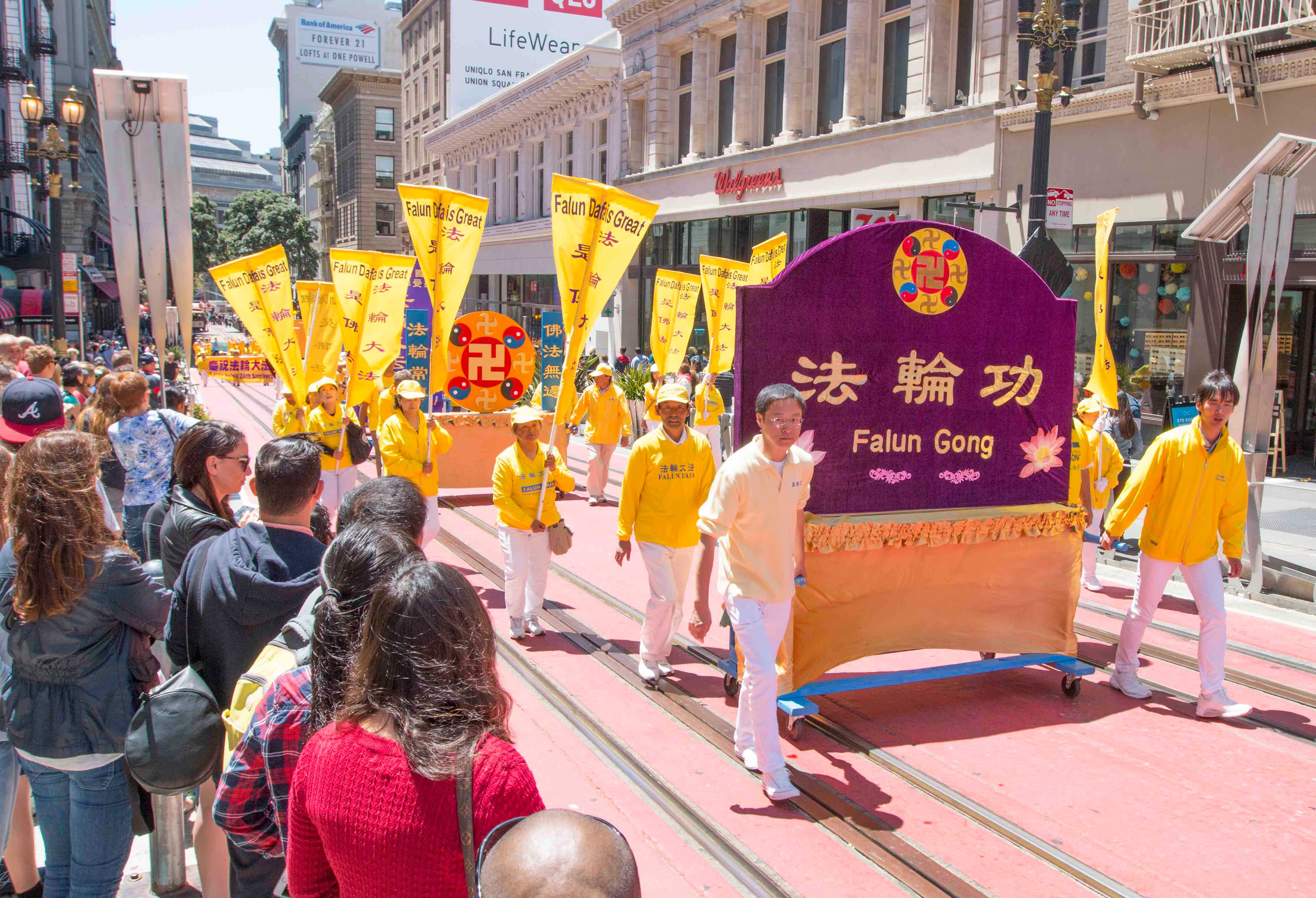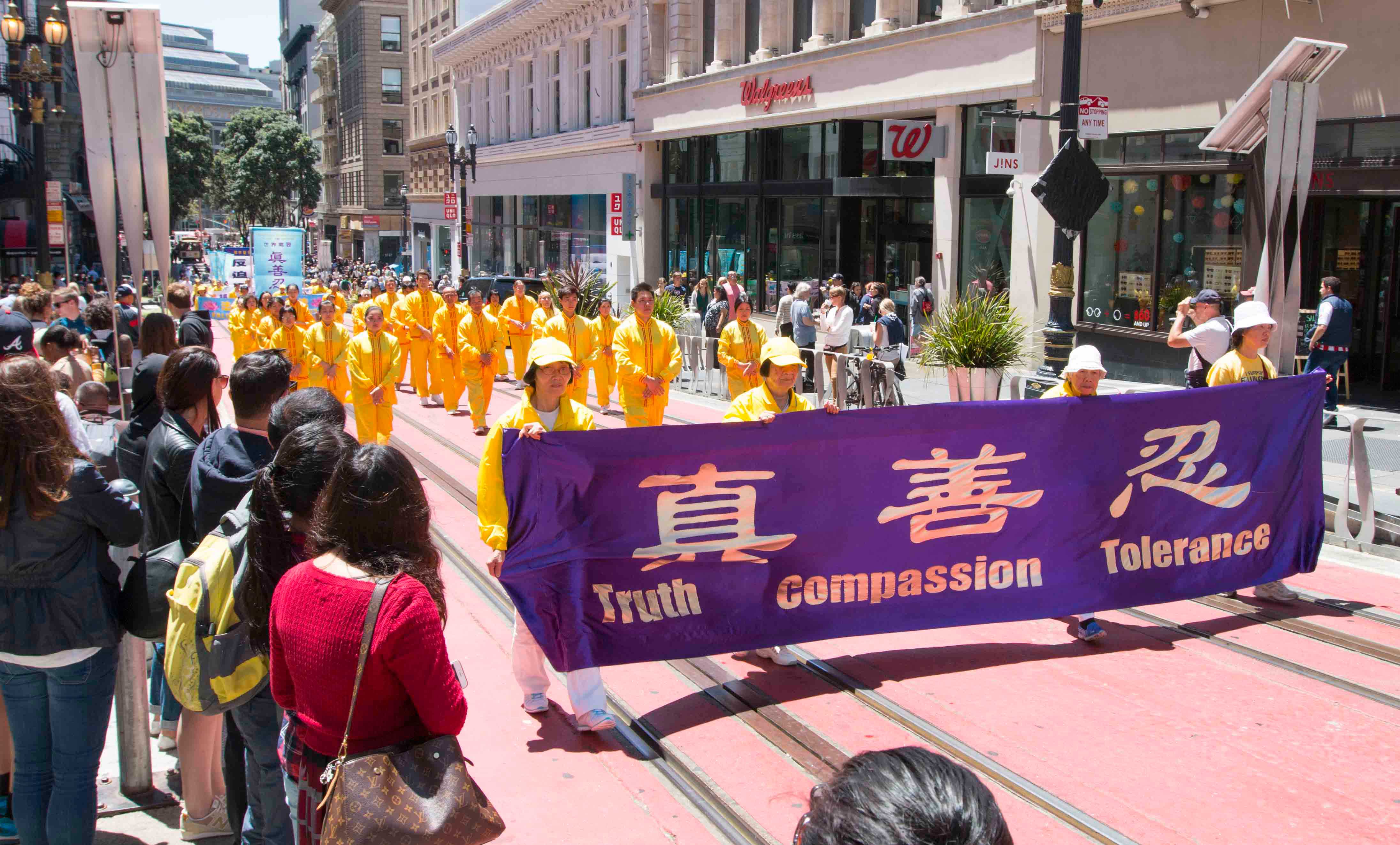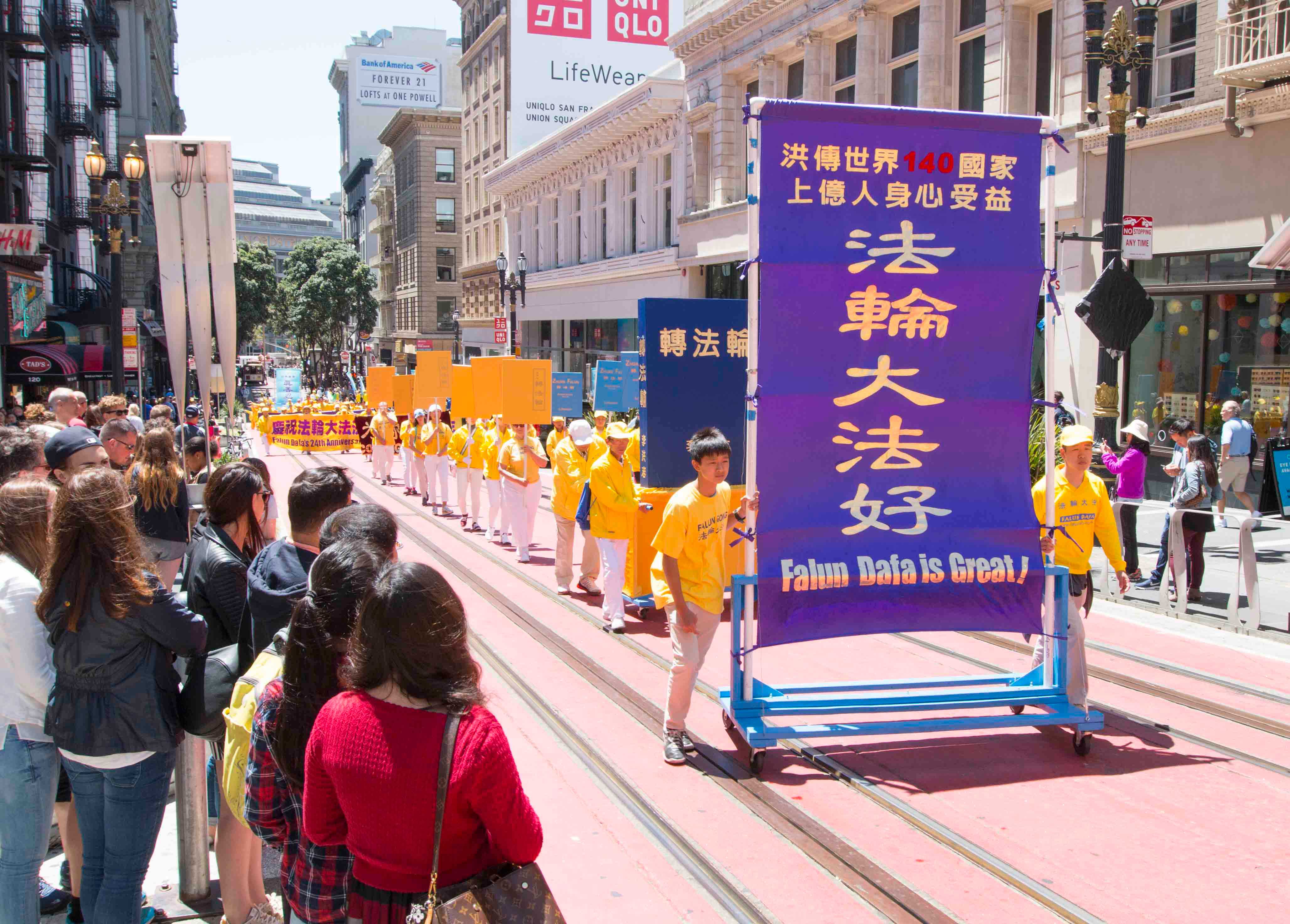 游行队伍由四个方阵组成:第一方阵是法轮大法好,由美西天国乐团和炼功队组成;第二方阵是停止迫害法轮功。由身穿白色服装的学员手持被迫害致死同修的遗像,反迫害图片和反酷刑演示车组成;第三方阵是全球起诉江泽民。法轮功学员举着展版向人们展示江泽民的罪行。第四方阵是·九·评*、退!党!方阵。他们举着声援二亿四千多万中国人三:退.的横幅和展板,呼吁民众赶快退出中共的邪恶组织。