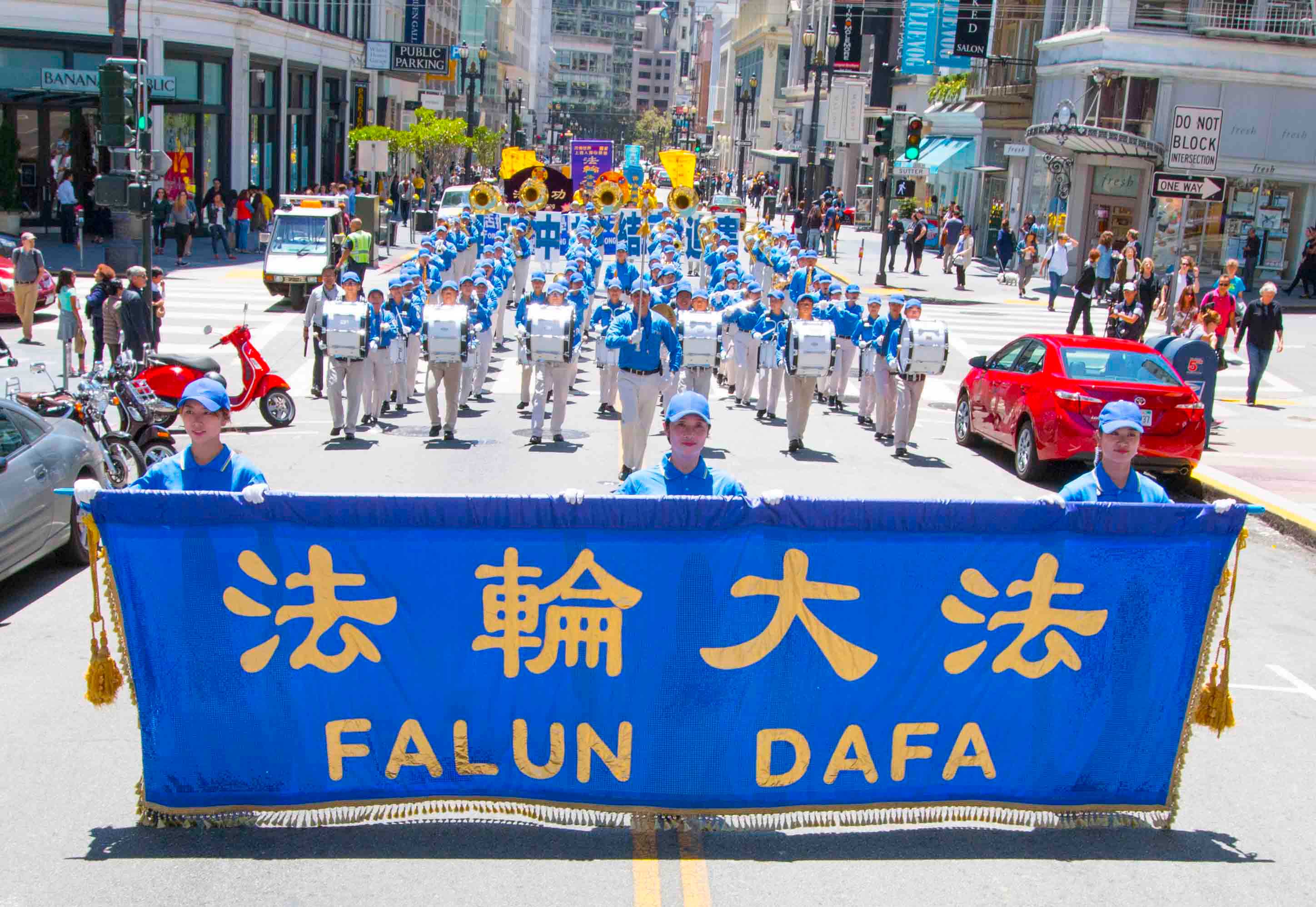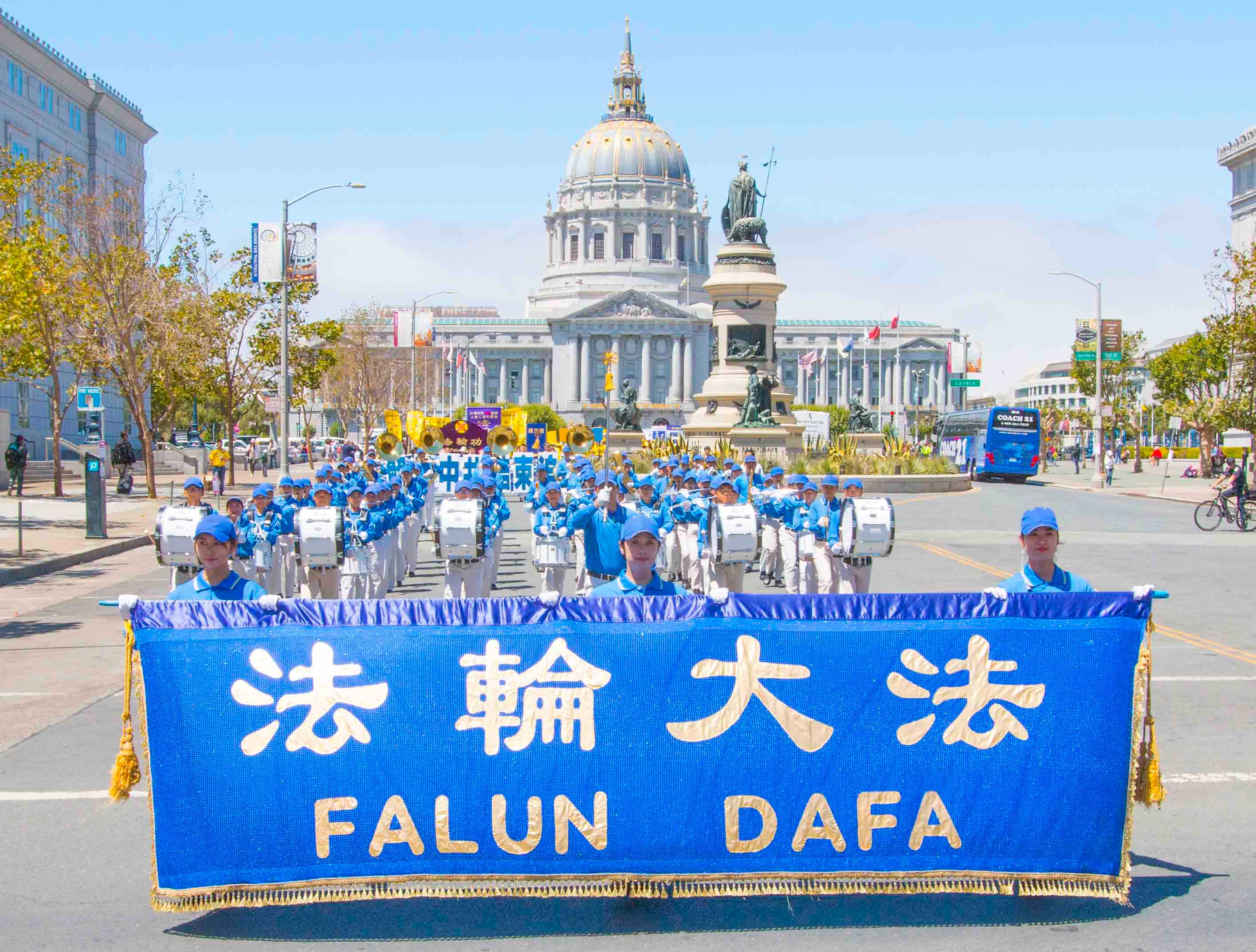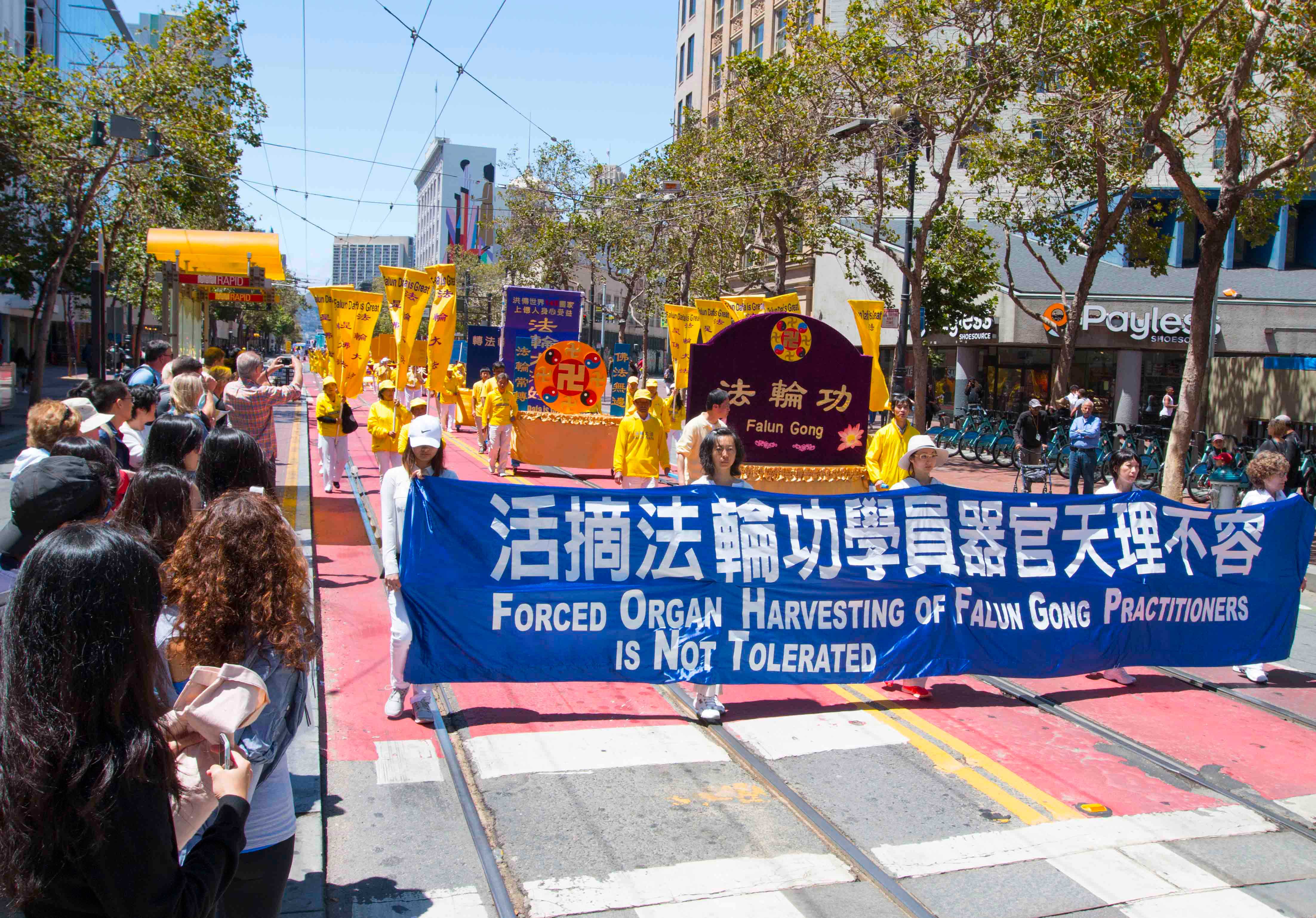 游行队伍由四个方阵组成:第一方阵是法轮大法好,由美西天国乐团和炼功队组成;第二方阵是停止迫害法轮功。由身穿白色服装的学员手持被迫害致死同修的遗像,反迫害图片和反酷刑演示车组成;第三方阵是全球起诉江泽民。法轮功学员举着展版向人们展示江泽民的罪行。第四方阵是·九·评*、退!党!方阵。他们举着声援二亿四千多万中国人三:退.的横幅和展板,呼吁民众赶快退出中共的邪恶组织。