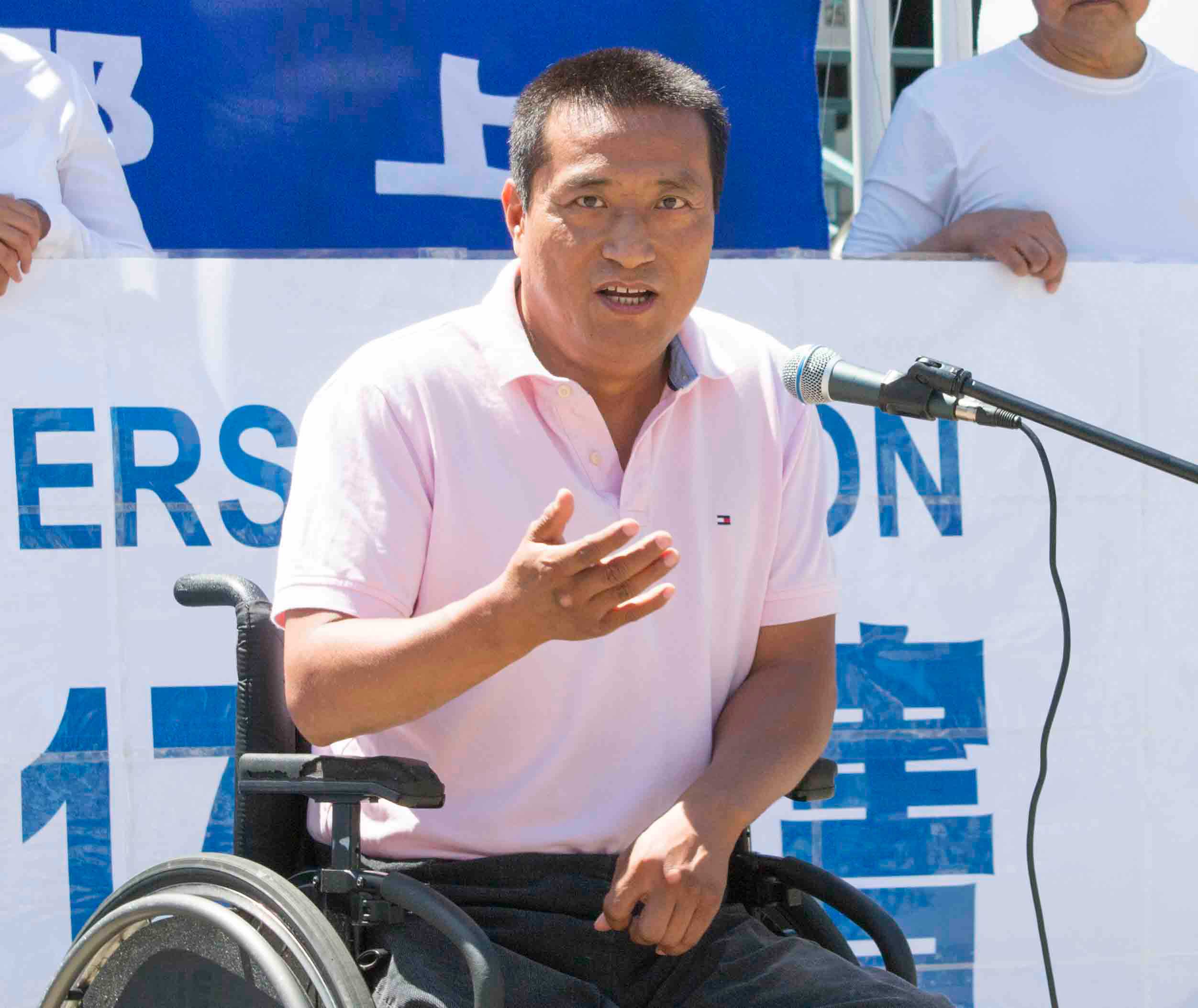 一九八九年六四天安门事件中,被中共坦克压断双腿的方政说:“一九九九年七月二十日,法轮功学员遭受了中共最残酷的迫害,这是每个人都应该记住的日子。今天来到这里,表达对法轮功学员的支持。现在看到很多以前没有了解的真相:法轮功学员被活摘器官。美国众议院通过的343号决议,太有划时代的意义了。”