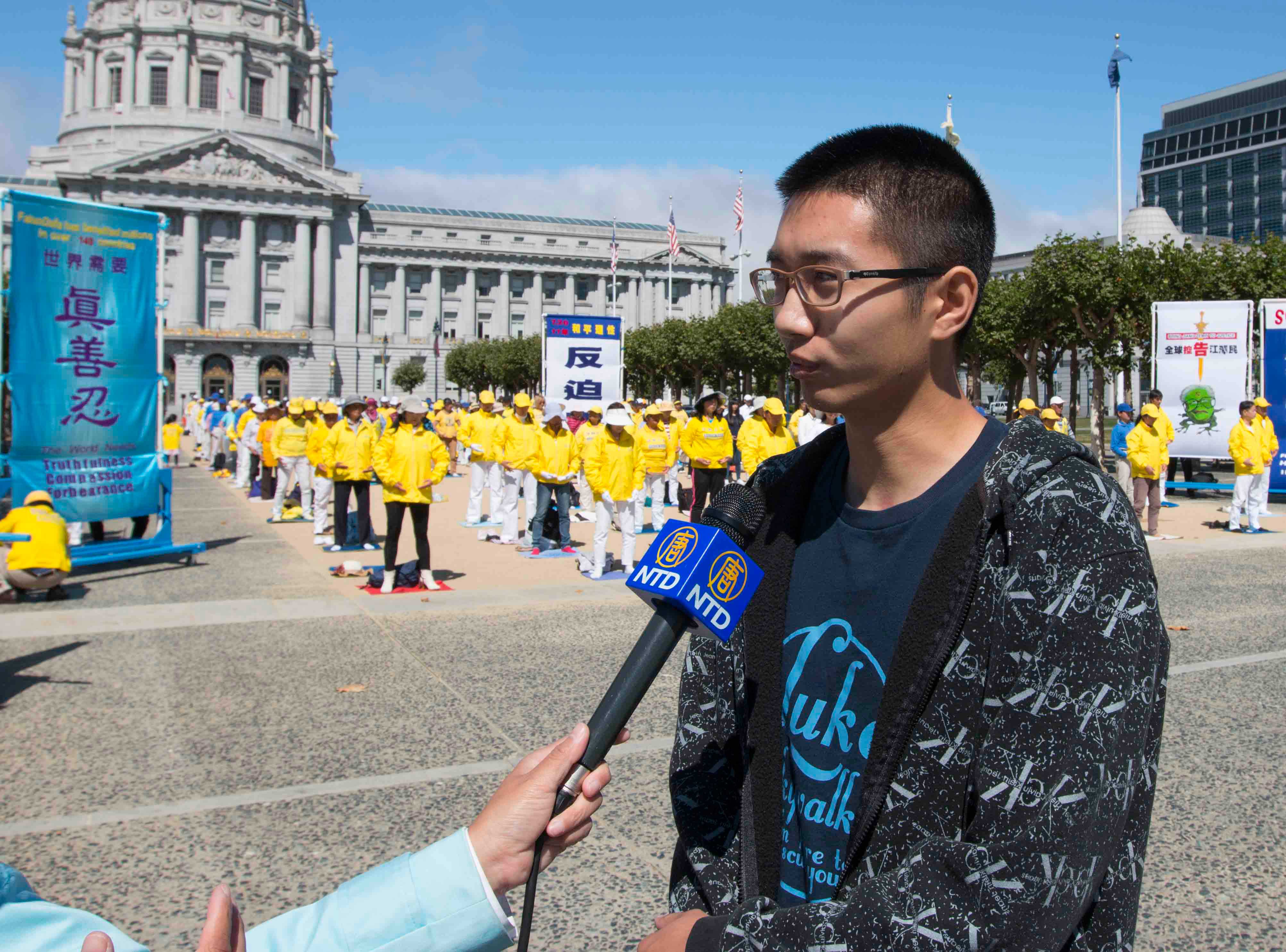 美国陆军士兵Glan经过市政厅广场,看到法轮功学员在炼功,他停下来面对法轮功学员鞠躬,他表示,他经常经过这里,看到法轮功学员祥和的炼功场面。他说:“我认为法轮功很美,非常棒,他们在这里打坐太美了。我知道在中国发生的迫害,太恐怖了,他们在那里没有自由。”