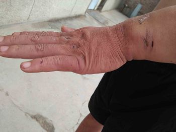 接连两、三天这样,有人叫来110,把赵九州带到了蠡县国保大队。蠡县国保大队要拘留赵九州十天,可当天下午国保就让家人把他接回家,说是他精神不好,赶紧接回家。家人并不知道国保大队打赵九州了,赵九州回家后,情绪渐渐稳定,第三天,赵九州才说,公安局的人打他了。