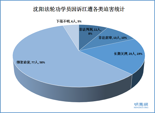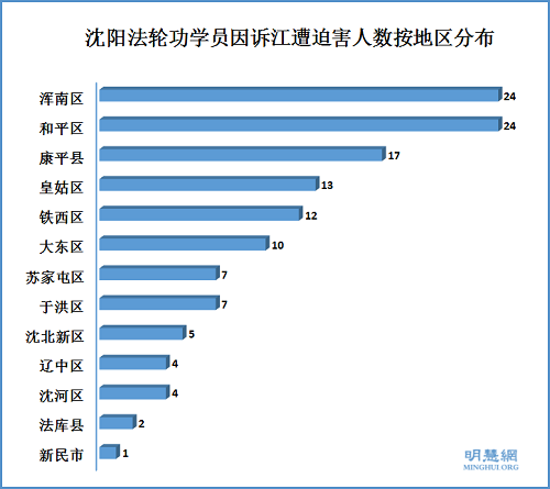 截至二零一六年七月十四日,据明慧网不完全统计,沈阳市依法控告江泽民的法轮功学员中,至少有十一人被非法判刑,有十三人被非法庭审,有二十五人被长期关押,有七十七人被绑架迫害,有六人下落不明。