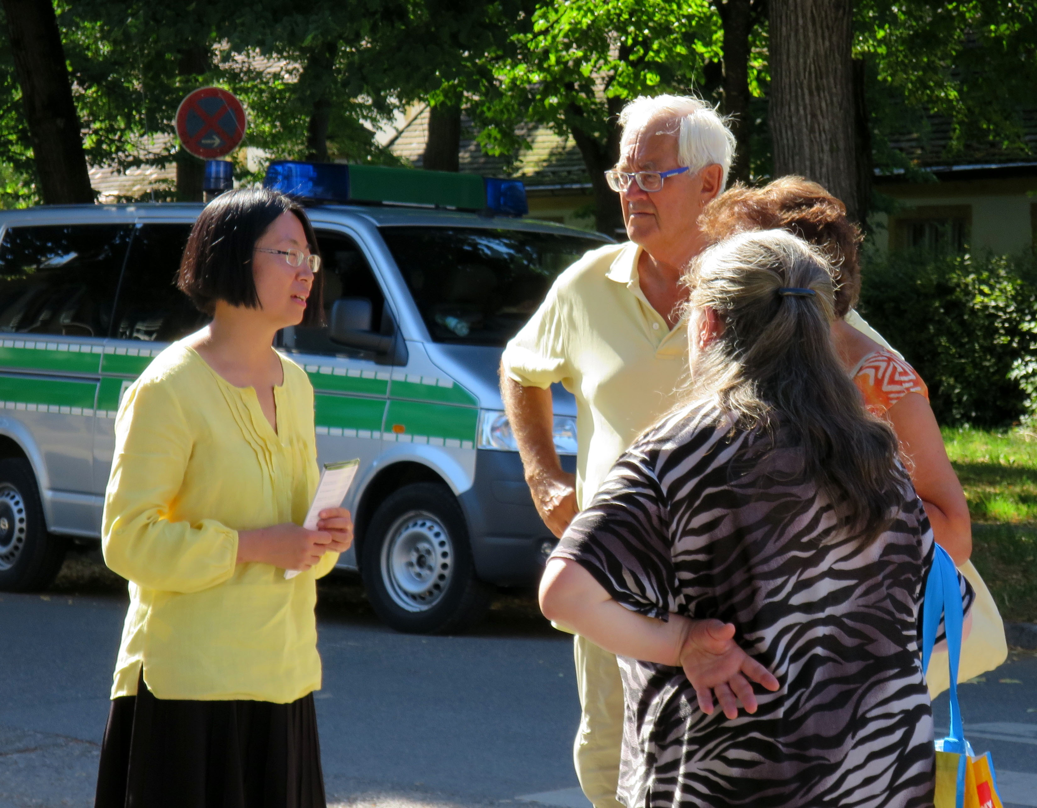 自从中共一九九九年七月二十日开始迫害法轮功以来,法轮功学员经常在慕尼黑中领馆前举办类似的活动,周边的居民对法轮功学员和中共对法轮功的迫害都有了一定的了解,很多路过的人都表示已经签名声援法轮功学员了。这次法轮功学员碰巧遇到他们时常举办活动的地点旁的房主,表示希望不会给他们的生活带来不便,房主笑着说:“恰恰相反,你们的活动非常平和,非常美好,很安静。”他们并表示已经签过名声援法轮功学员了。