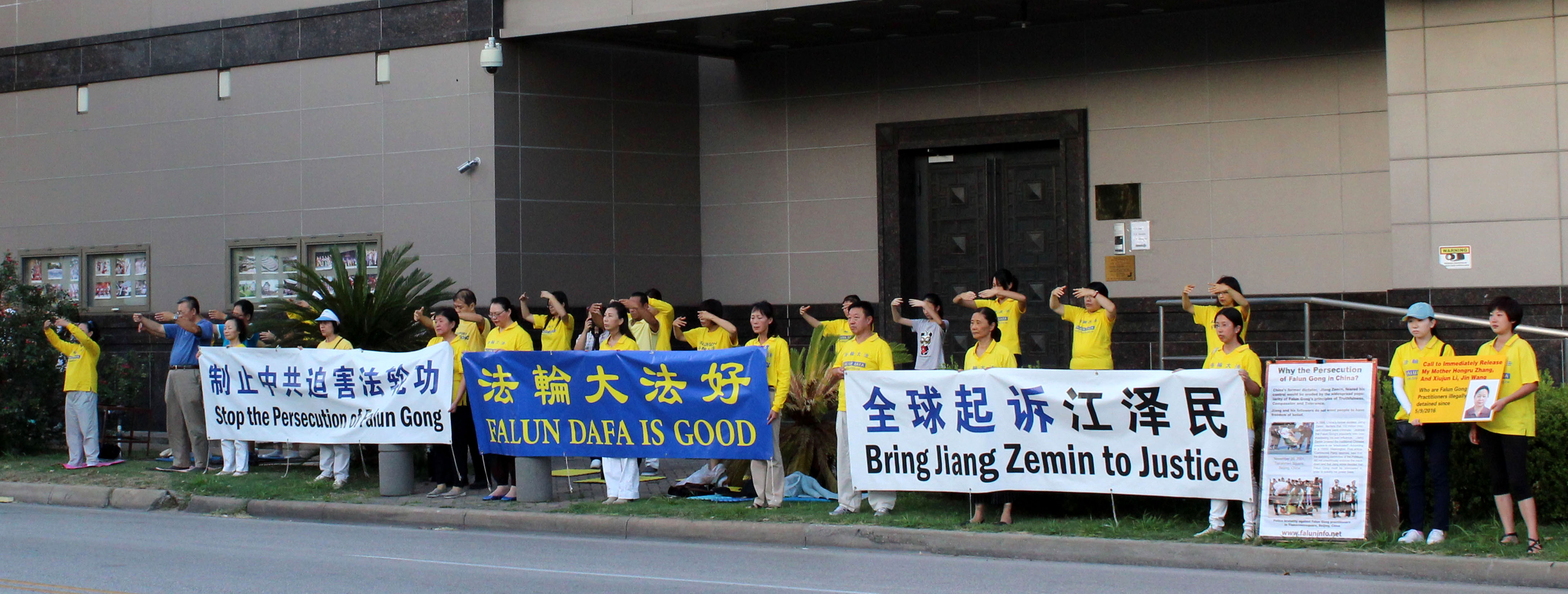 七月二十日休士顿天空晴朗,炎热高温,上午法轮功学员在中领馆前举行和平理性集会,学员在中领馆前手持中英文横幅:“法办江泽民”、“停止活摘器官”、“停止迫害法轮功”,以及活摘器官真人模拟展示中共活摘器官等。中领馆位于休士顿蒙确大道((Montrose Blvd) ,来往车辆很多,出入中领馆签证的华人及其他族裔人士,对法轮功的活动予以关注。