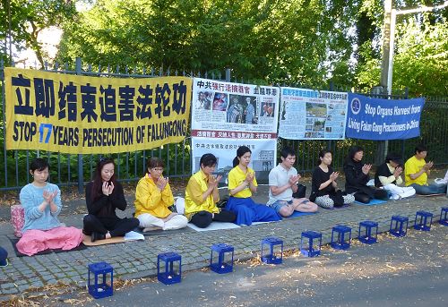 当地时间傍晚七点,北欧盛夏的傍晚依然艳阳高照,法轮功学员们点起了蜡烛,在深沉舒缓的音乐“烛光”的伴随下,回顾这十七年来和平反迫害的历程……。