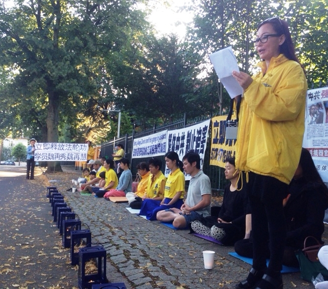 【明慧网二零一六年七月二十二日】(明慧记者林彤丹麦哥本哈根报道)二零一六年七月二十日,部分丹麦法轮功学员来到首都哥本哈根中使馆门前,举行烛光守夜,纪念法轮功学员和平理性反迫害十七周年,悼念在这场邪恶迫害中,被中共江泽民集团迫害致死的大陆同修。同时要求中共立即释放被非法关押的法轮功学员。并规劝中使馆工作人员早日认清是非善恶,唾弃中共,为自己和家人留后路。