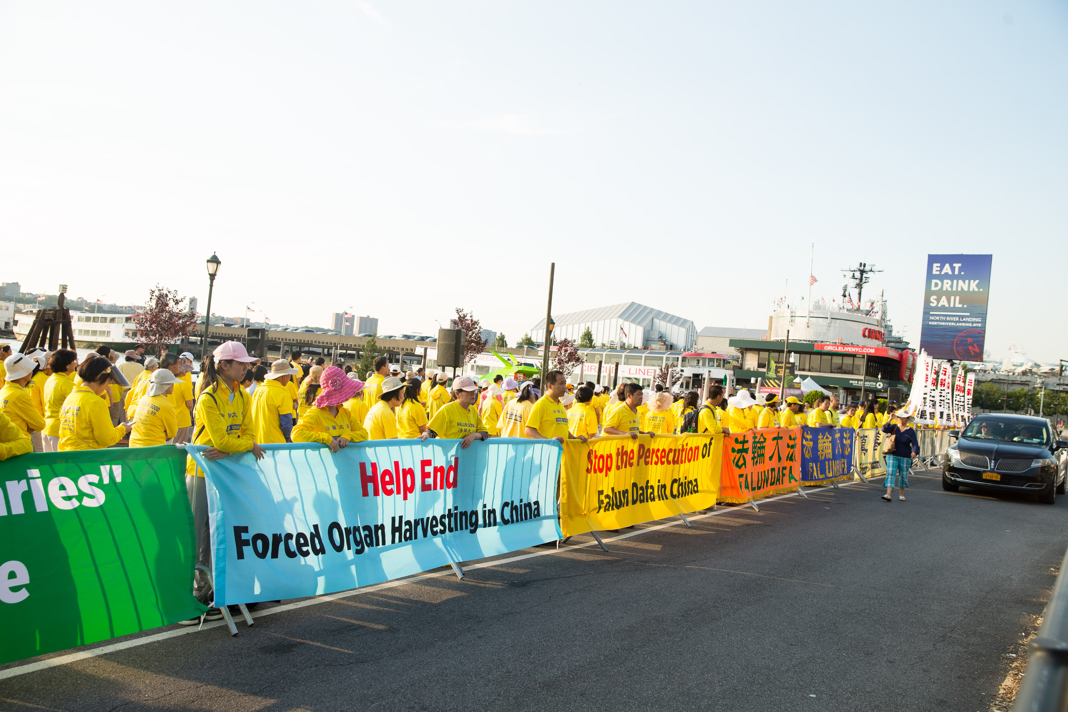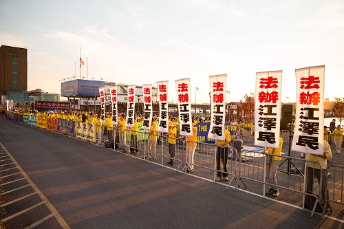 傍晚,法轮功学员们在中共驻纽约总领馆前举行烛光夜悼,纪念反迫害十七周年,要求中共立即停止对法轮功修炼者的残酷迫害,同时纪念十七年来在中共镇压下被迫害致死的同修,呼吁法办江泽民。