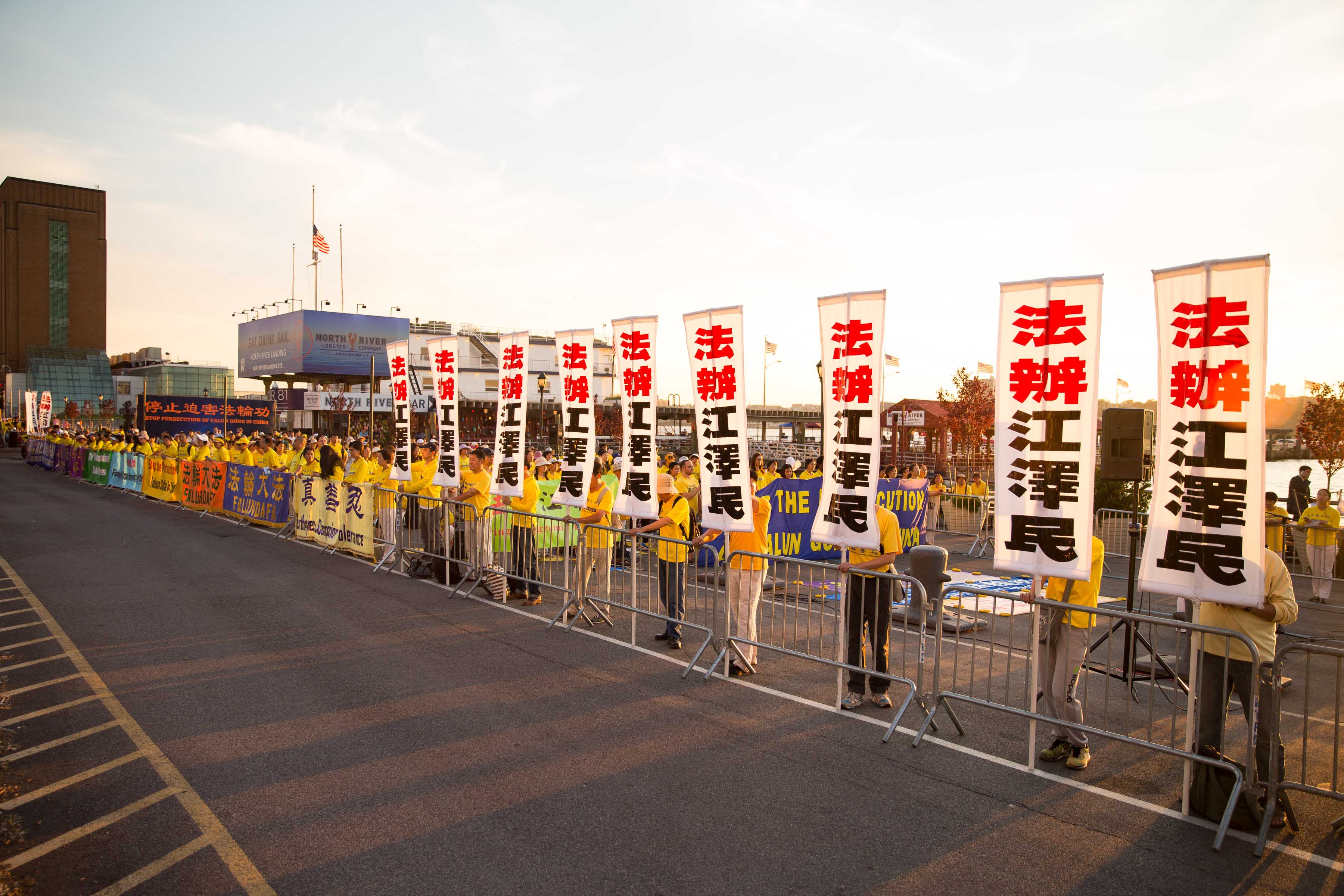 夜幕低垂,华灯初上,上千名法轮功学员身穿黄色T恤衫,手举灯烛,在淡淡的夜色中,肃然的静坐着。边上哈德逊河静静地流淌着,聆听着他们的感天动地的传奇。前后的横幅传递着他们心声:法轮大法好,停止迫害法轮功,法办江泽民。