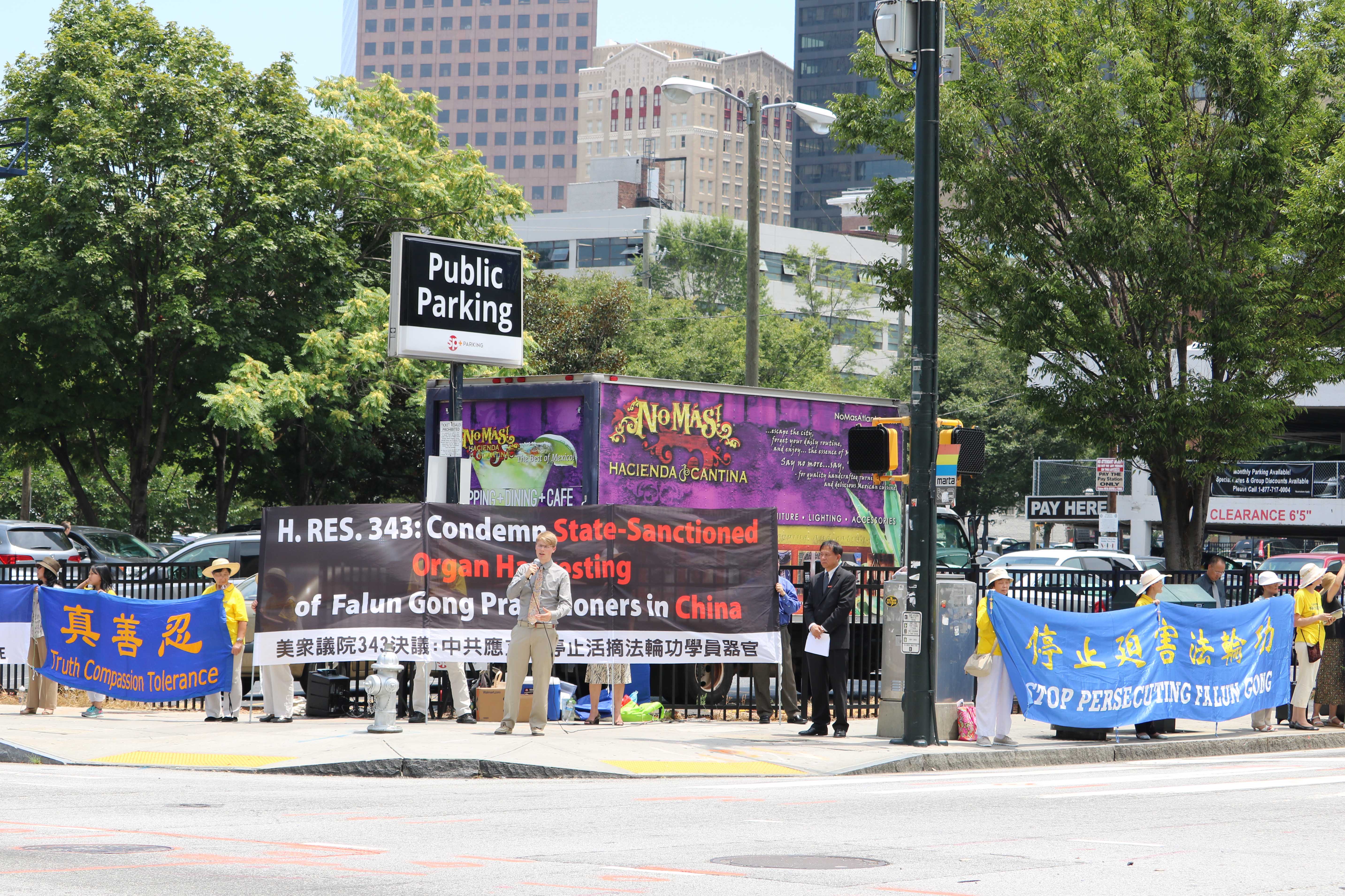 他说:亚特兰大的法轮功学员之所以今天在这里集会,是因为十七年前的这一天,中共前党魁江泽民发动了对这些和平的修炼人的迫害,给中国上亿人带来了灾难。成千上万的法轮功学员的家庭被破坏,失去了工作,被酷刑折磨,甚至失去了生命。直到今天,迫害还在继续。二零零六年,令人震惊的黑幕被曝光,中共居然从法轮功学员身上活体摘取器官,用以牟利。他还表示,由于世界法轮功学员们不懈的努力,越来越多的世人了解了真相,纷纷觉醒,支持法轮功反迫害的正义之举。到今天,已经有二亿四千万中国人退出了中共及相关组织。