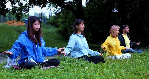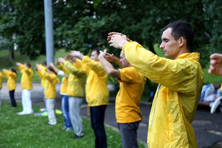 图1-4:二零一六年七月二十日,反迫害十七周年,莫斯科法轮功学员在中领馆附近举行了功法展示,向世人展现“真、善、忍”的美好与学员们大善大忍的精神,讲述法轮功的真相。 |