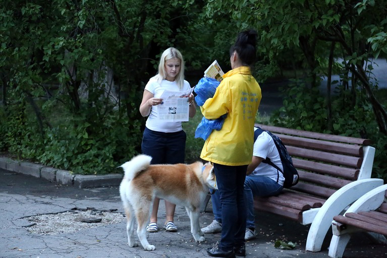 图8:二零一六年七月二十日,反迫害十七周年,俄罗斯法轮功学员在下新城传播真相。 |