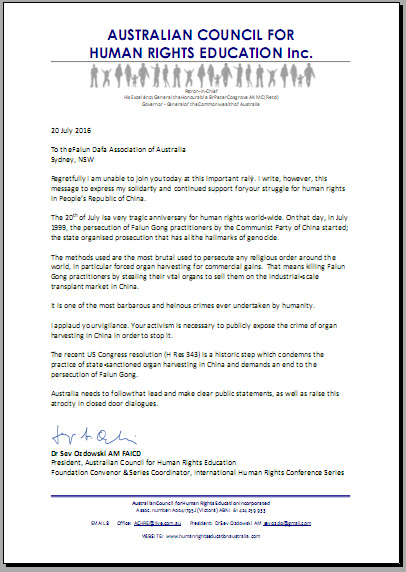 澳洲勋章获得者、澳大利亚人权专员西弗博士(Dr Sev Ozdowski OAM Australian Human Rights Commissioner(2000-05))特致信对无法出席集会深表歉意,并表示他将一如既往的强有力和长期对法轮功团体反迫害的支持。