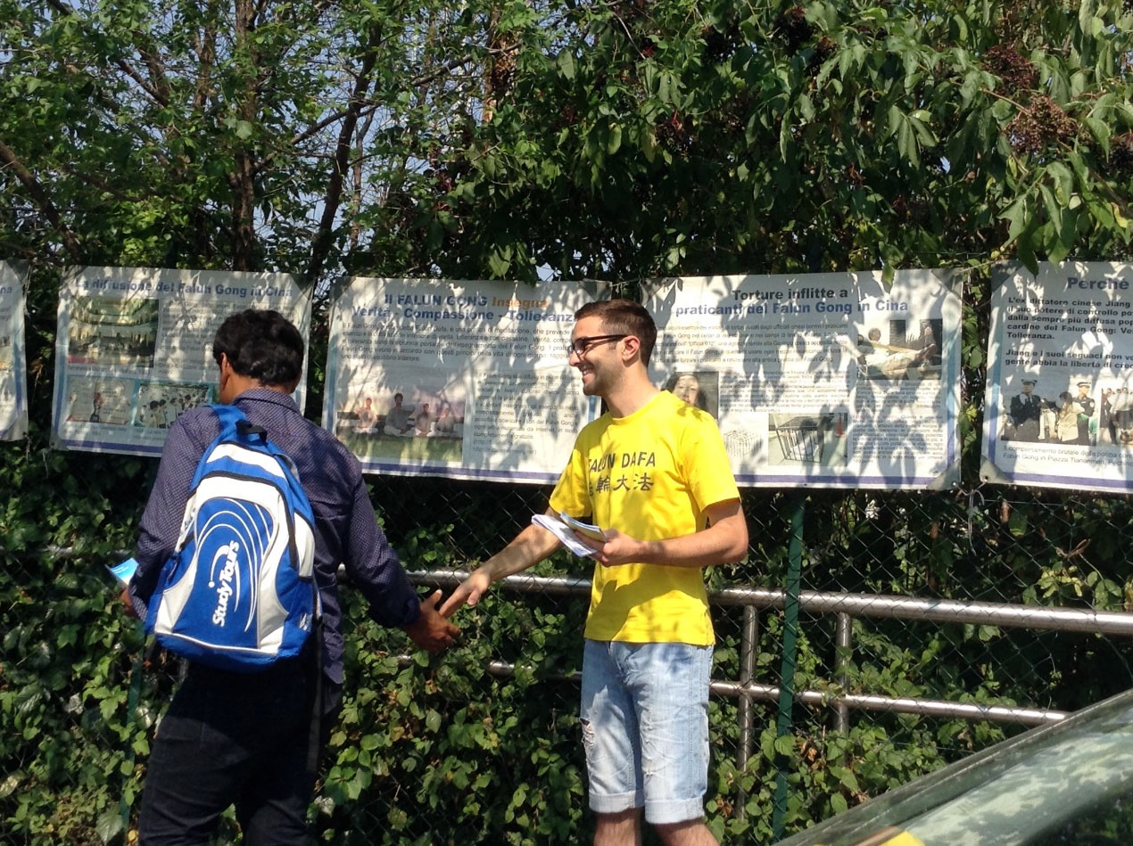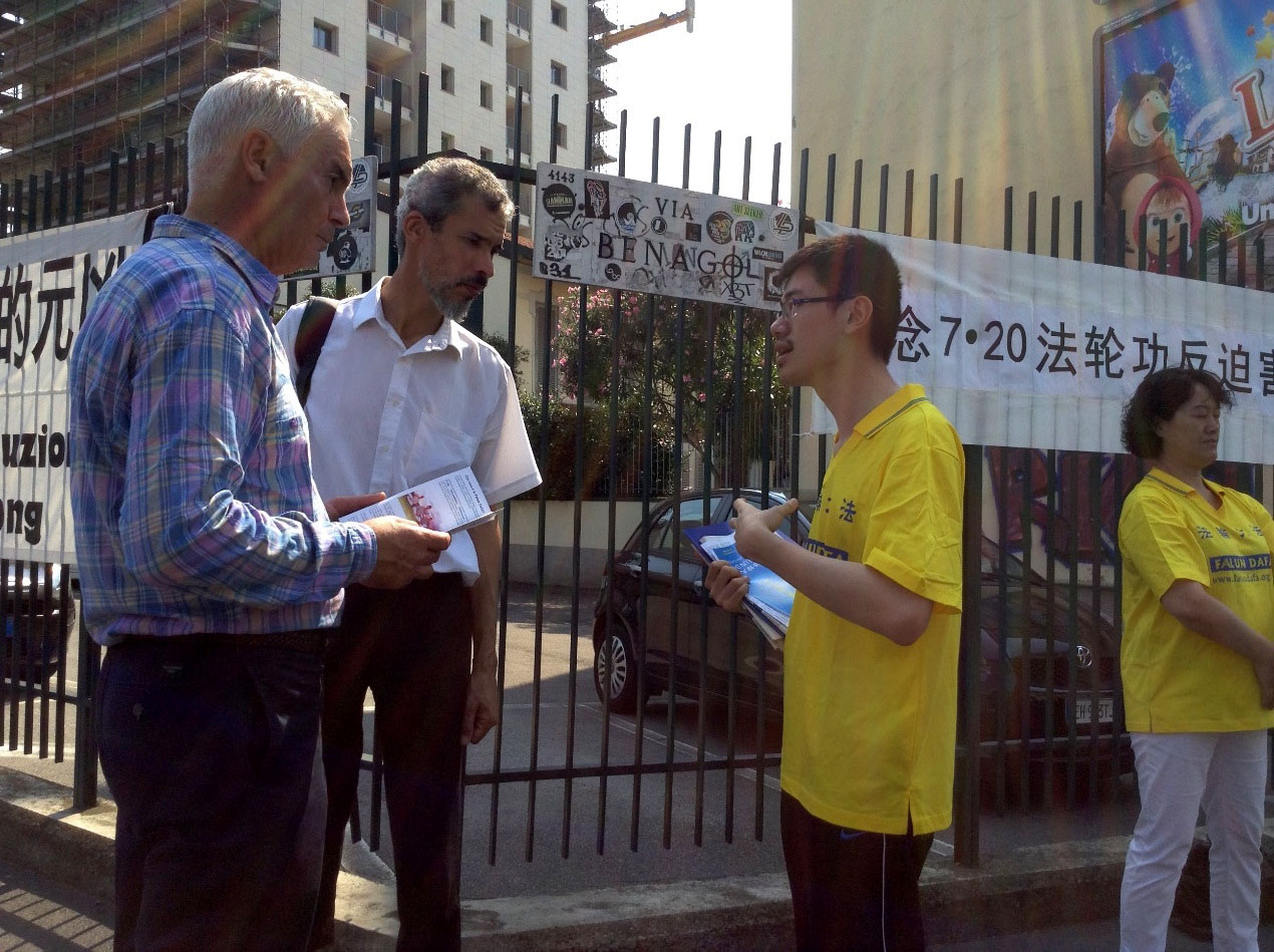 一位住在附近的意大利老人对学员笑容满面的说,今天这么热,你们还坚持在这儿,看到你们真的很好!还有一位意大利男士告诉学员,他以前接过我们的传单,他知道迫害真相,在走出几米远后,又转身向学员竖起了大拇指,意思是“了不起!”。