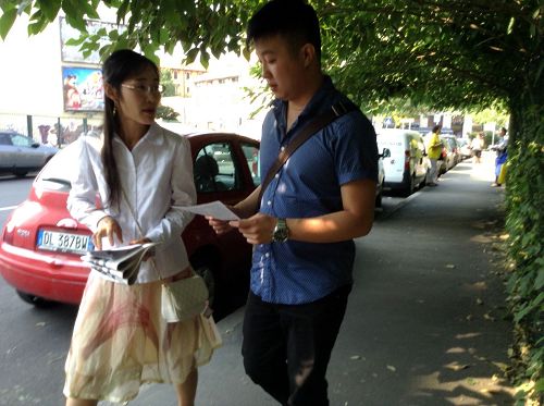 图2-4:意大利学员向过往中西方民众讲述法轮功及其迫害真相。