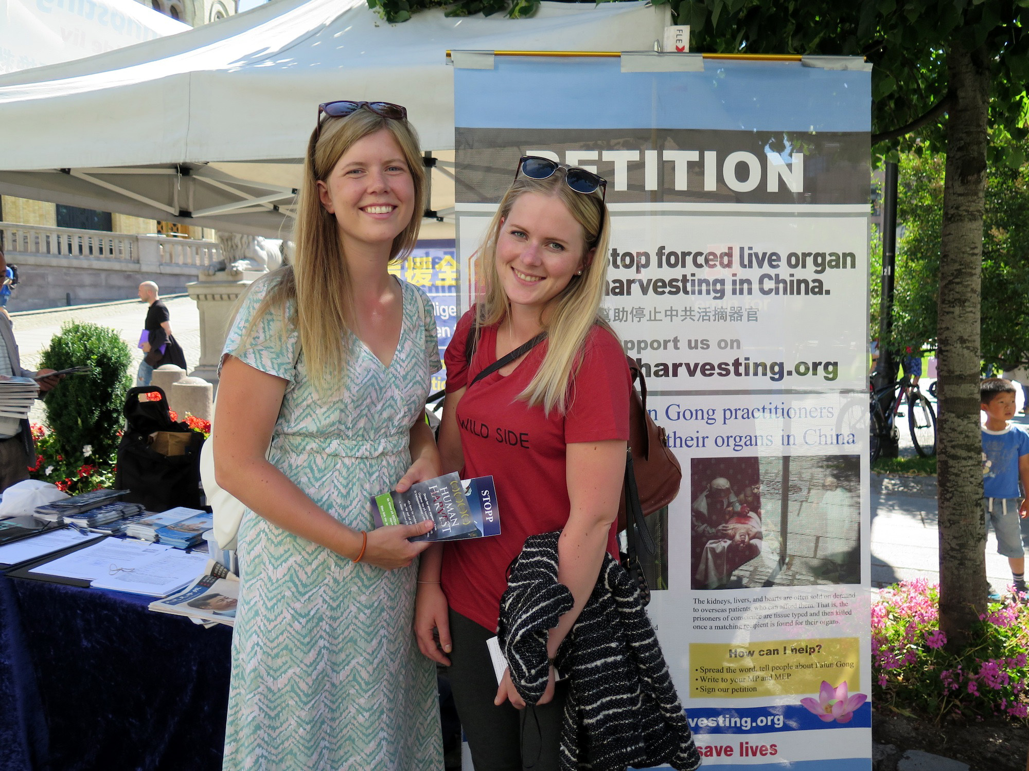 卡米拉(Camilla)再过几个月就将从奥斯陆大学政治系《和平与冲突研究》专业毕业,目前她正在撰写关于种族冲突的硕士论文。她与来奥斯陆做客的好友本娜迪科德(Benedikte)在国会前看到法轮功学员的真相点时,对法轮功学员正在遭受的迫害表示关注。她们说:“活摘关系到人性,你们做的这件事非常重要!感谢你们传递的这些信息!”