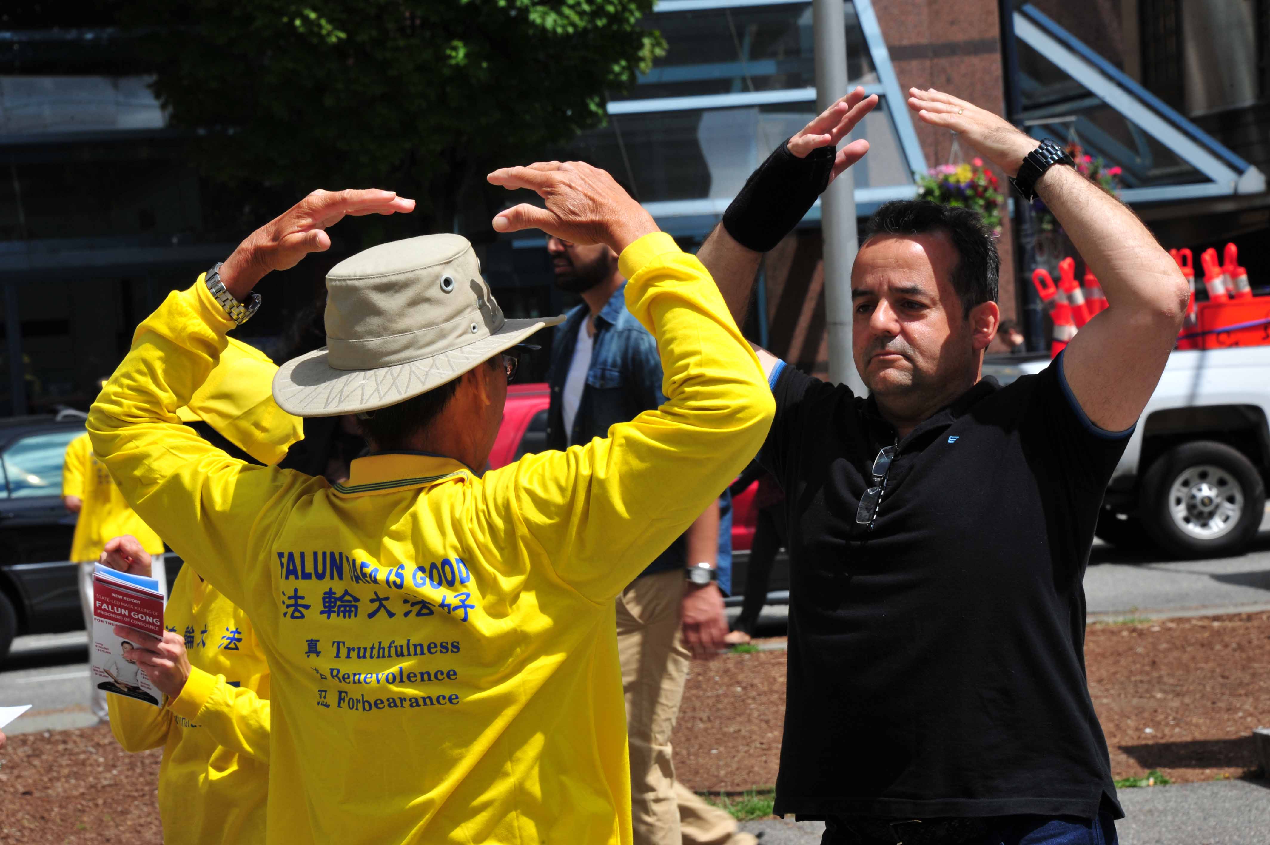Elias Ishak先生将以独立候选人身份参加下届加拿大卑诗省议员选举,他前来七月二十日的活动现场并发言,他说:“我宣布我用我的全部身心坚定支持法轮大法。中共是这个世界的残渣败物,中国人民将最终获得胜利,战胜中共的腐败扰民的政权,中共不代表中国,法轮功才是中国的象征。法轮功真正诠释了中华文化的美好和尊严。尽管有些法轮功学员被迫害致死,但他们死的崇高而尊严,人可以带着尊严的灵魂死去,人不能没有尊严的灵魂活着。拥有信仰和为自由而死去的人,将在世人的心中获得永生。中共用屠杀的方式迫害法轮功将注定失败,我将持续不懈地支持法轮功反迫害。”