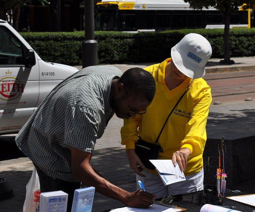![]() 达拉斯法轮功学员在市中心集会纪念反迫害十七年,民众踊跃签名支持法轮功 |