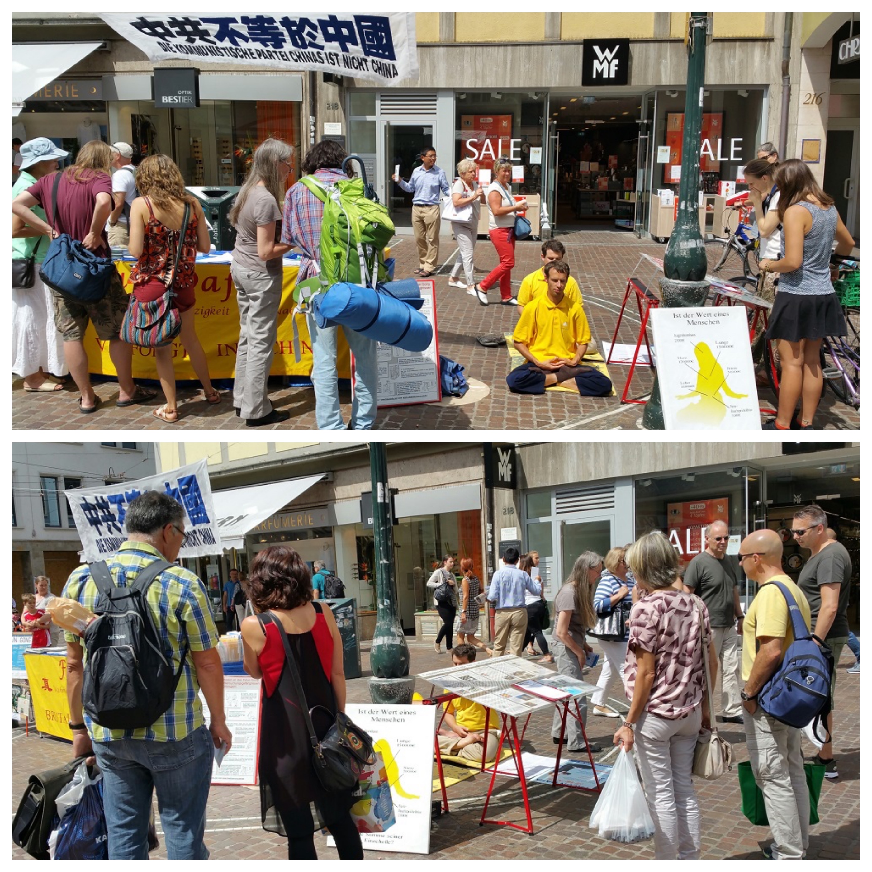 号称大学城的弗莱堡市,据不完全统计,有上千名大陆留学生和访问学者。当天活动中,学员先后和几拨留学生讲述法轮功的真相。法轮功学员让他们抬眼看看信息台上悬挂的横幅“中共不等于中国”,学员说,这条横幅今天就是为你们挂上的。你们都是可贵的中国人,请不要拒绝真相,失去自救的机会。有人接了真相资料,说回去仔细看看,好好想想。