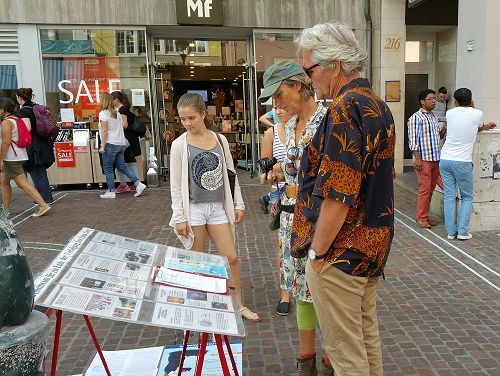 去看真相展板,或走向信息台,或找法轮功学员了解详情。