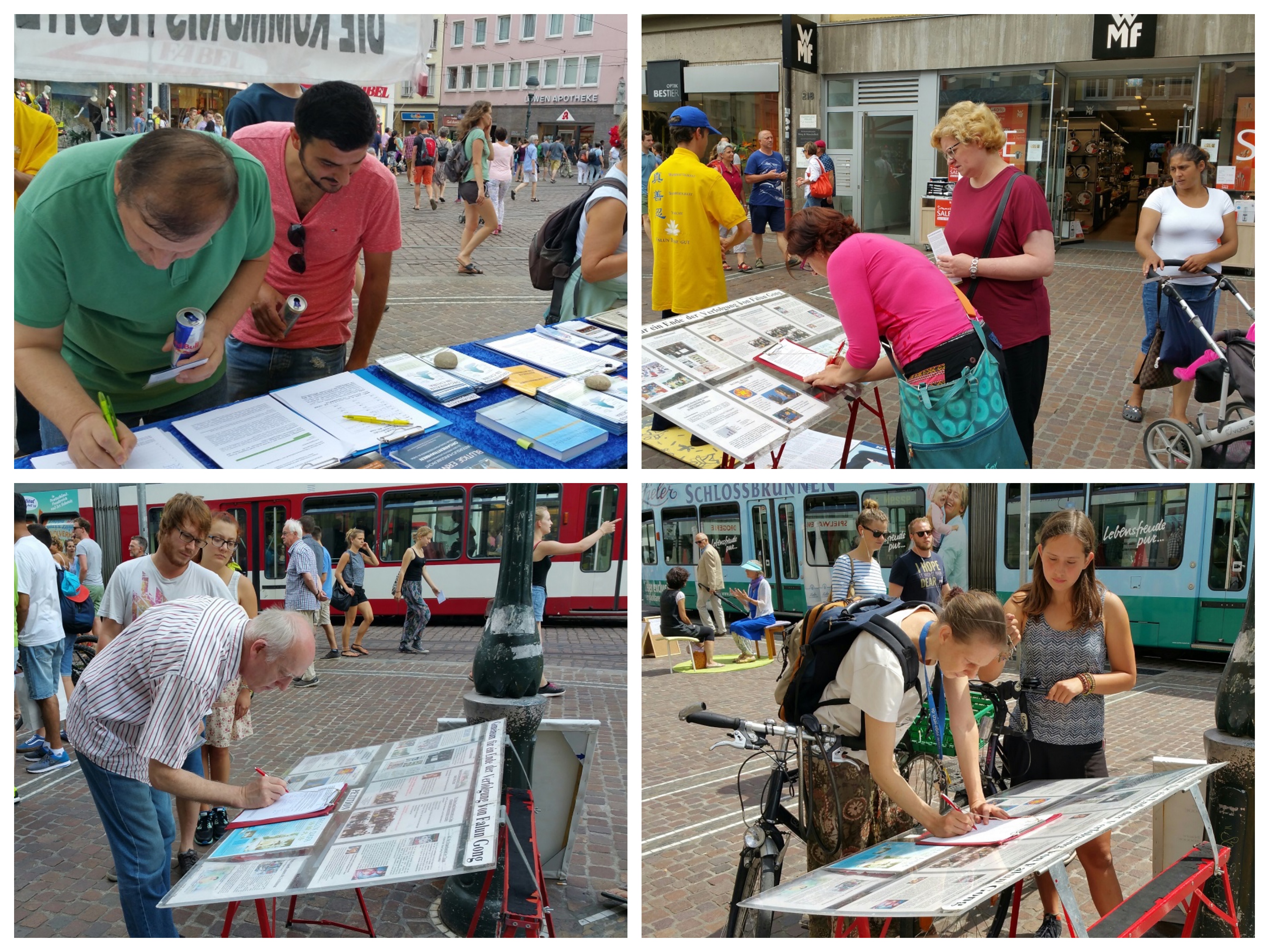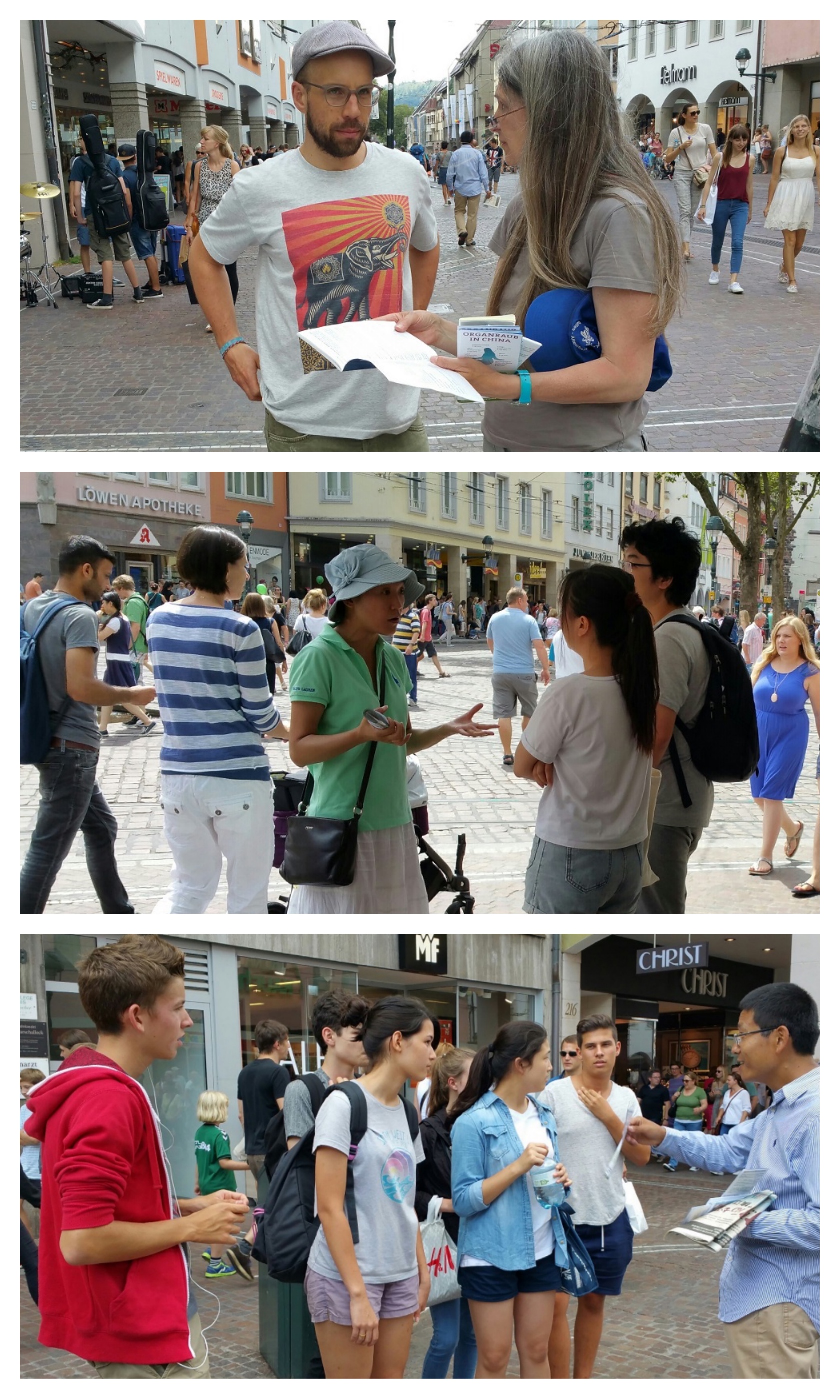 ![]() 图1-2:二零一六年七月二十二日,法轮功学员在德国大学城弗莱堡市传播法轮功的真相,一群一群的民众驻足阅读真相展板。 |
