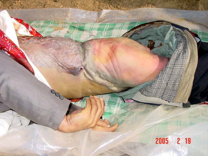 给郭士军更换衣服时,在场的人非常震惊:他的全身伤痕累累,体无完肤。被劳教所的警察用高压电棍等刑具打的没有一处是好地方,就连肛门和外生殖器官也遭到了损坏,都变形了,发黑,结肠从肛门脱出很长,这是多么残忍的酷刑呀!他内脏的毁伤又会怎样呢?