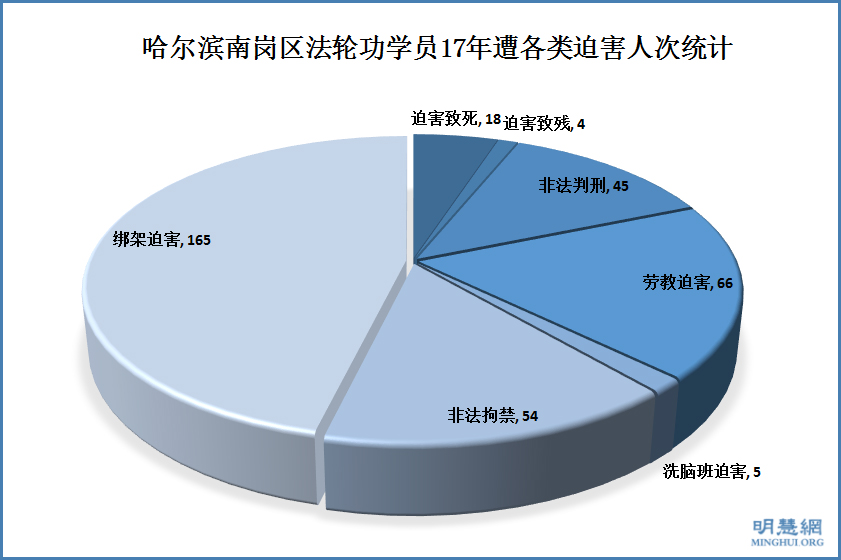 据明慧网的信息,在十七年间,南岗区的法轮功学员遭非法逮捕、庭审、判刑至少111例。