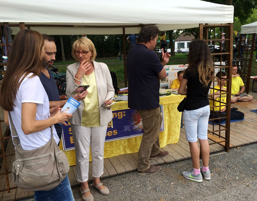 阿沙芬堡是一个位于法兰克福东南边三十公里的小城市,居民来自一百三十多个族裔,两天的庆典吸引了来自不同文化背景的人们。法轮功学员一直在摊位上展示功法,很多人走过时不觉放慢脚步,驻足观看,并向学员们打听炼功效果。他们表示,观看学员的炼功,感受到内心平和,整个氛围让人非常舒服。