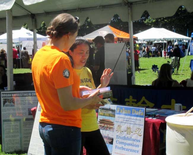 ![]() 图1-2:美国俄勒冈州波特兰第二十四届胡德美景节上,民众驻足了解法轮功 |