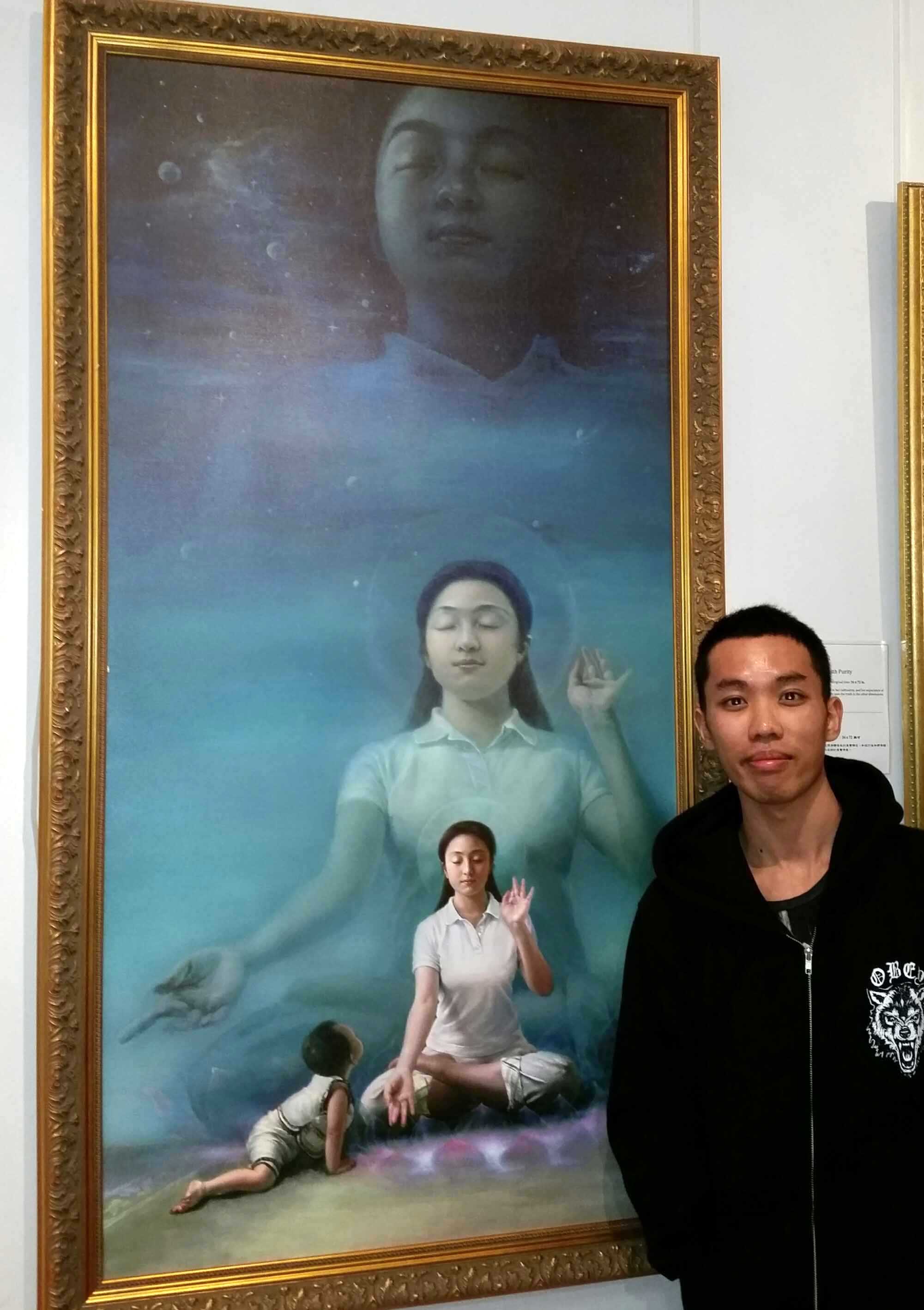 杰德(Jaden)是一名绘画爱好者,同时也喜欢打坐,注重和大自然的沟通。他说,身处展厅感受到很强的正能量,能感受到画作展现的境界充满神性。他对表现艺术家在海边打坐的《天人合一》尤为喜欢,“如果我们每个人都能达到这种平静、祥和的境界,那就太美妙了。”他向讲解员咨询了很多信息,如:法轮功如何修炼?法轮的真正美好意义?法轮佛法和佛教道教有什么不同?什么是我们的誓约?他越听越明白,内心受到震撼,他发现美展的安排很有序,在一步一步开启人的心灵,唤起人们对生命意义的思考,越看越听觉得殊胜。他对法轮大法产生浓厚兴趣,随后索取了相关资料准备学炼,他感到自己和伴侣走进了美展展厅非常幸运,最后在留言簿上分享自己的心情: