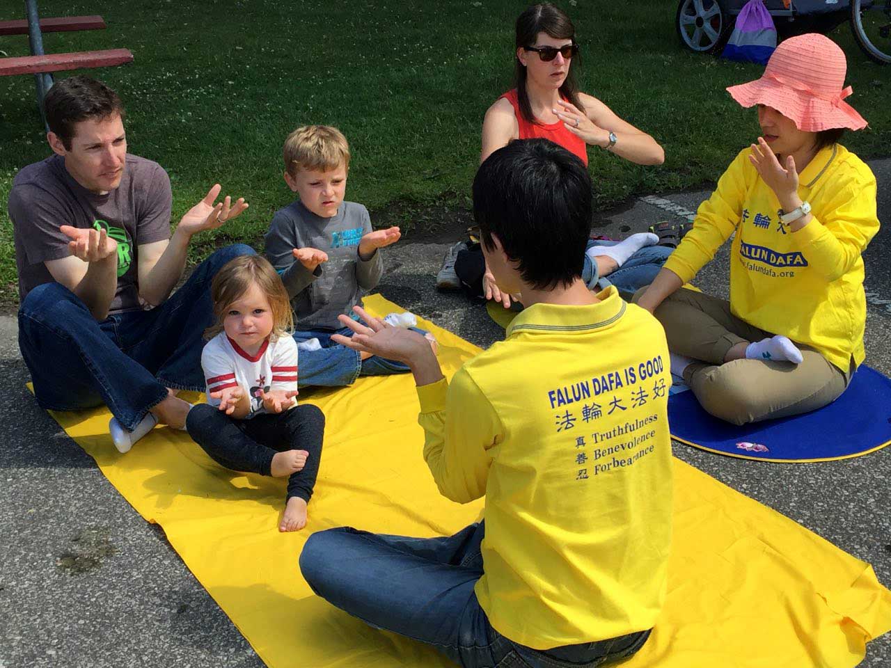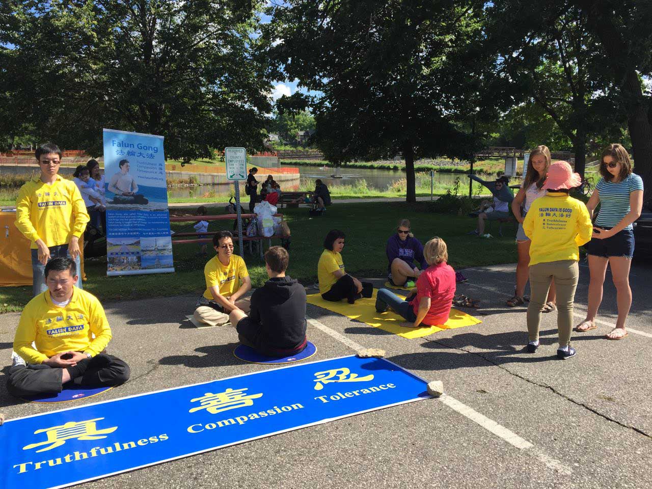 当日适逢美国独立日长周末,大法祥和的炼功音乐和美好的功法展示,吸引了当地市民络绎不绝前来了解和学习法轮功。短短两、三个小时,有数十位民众前来学炼法轮功。上至白发老者,下至幼儿,有的市民更是全家学炼。一位五、六岁的美国小男孩学第五套功法时,尽管盘腿很疼,仍坚持全程双盘。
