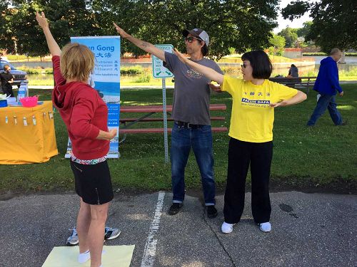 二零一六年七月二日,为了让这里的民众了解法轮大法的美好,明州法轮功学员应罗切斯特市农贸市场的邀请,举办了功法演示与免费教功活动。