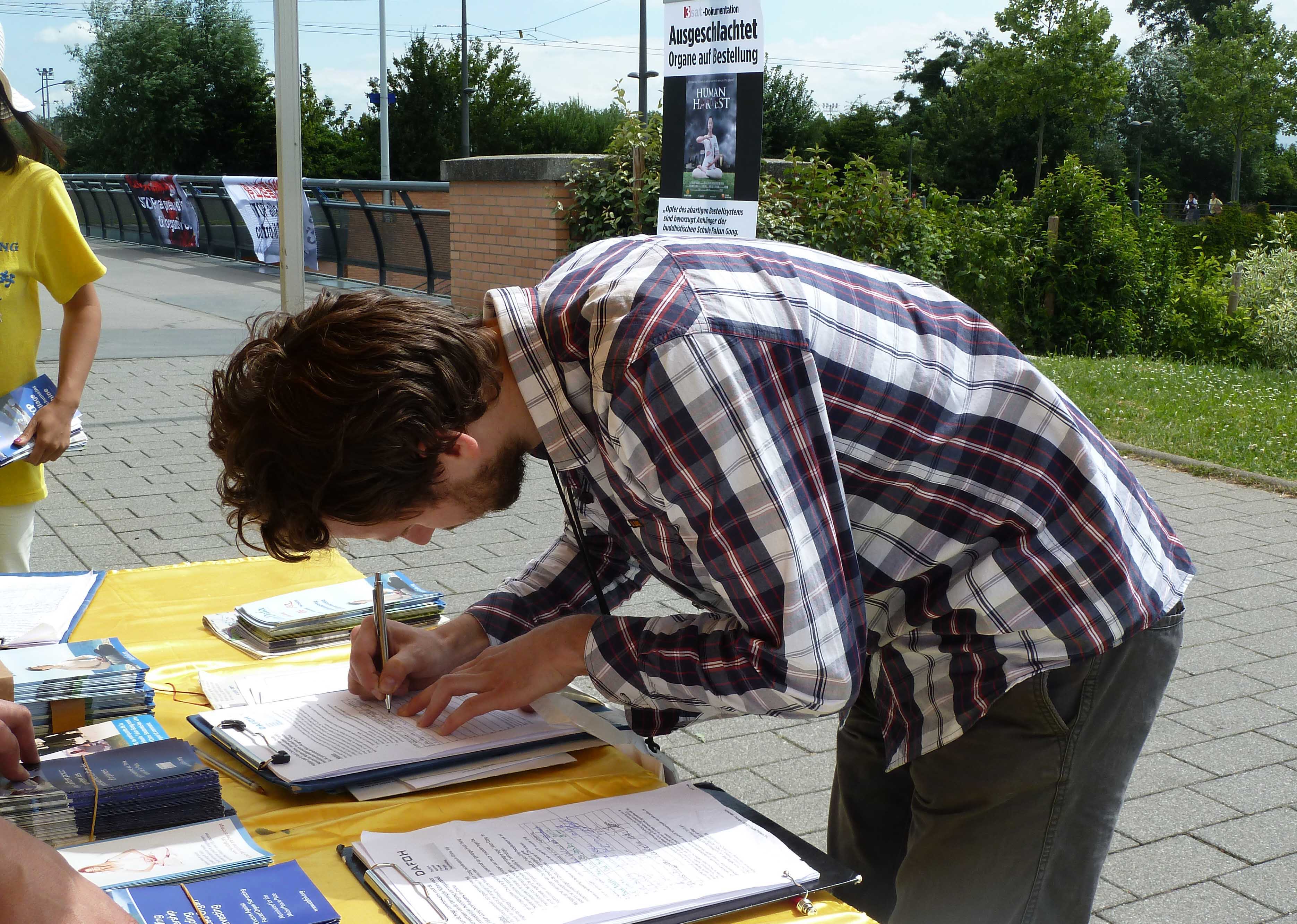 ![]() 图3:欧洲议会工作人员米歇尔•欧布利(Michael Oberli)签名反对活摘器官,还要把此事告诉同事。 |