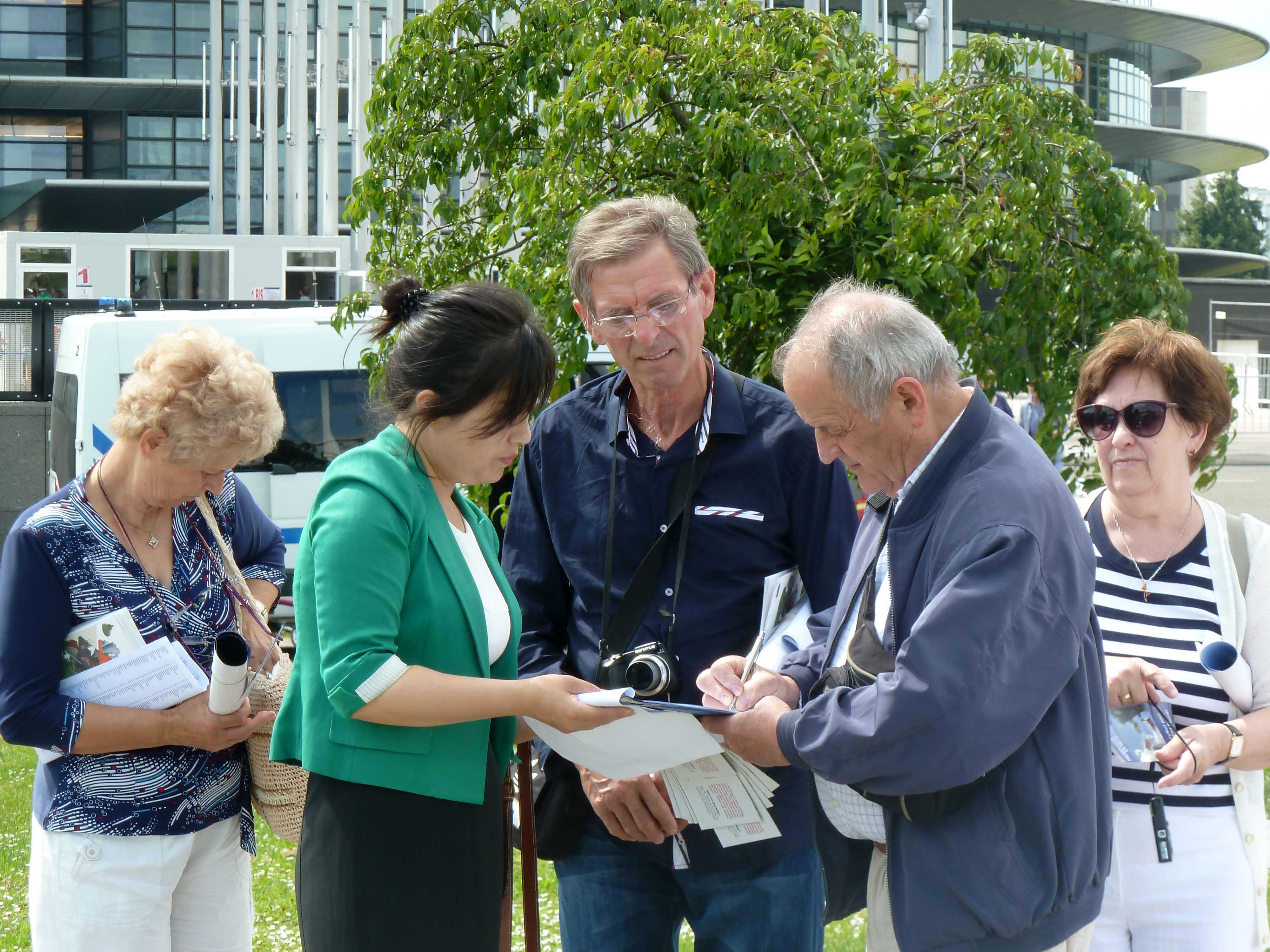 在欧洲议会中工作的人来自欧洲各国,但大多数是欧洲人,不过也有为数不多的华人。一位中国女士从议会中走出来,胸前带着工作人员的牌子。她路过法轮功的摊位时,看到这么多法轮功学员在炼功,很惊讶。她停下来拍照,一位法轮功学员上前与她攀谈,原来这位女士来自中国大陆,知道法轮功,但是并不了解迫害,也觉得不太可以想象会有这么残酷的事情发生。于是这位学员就跟她讲述了自己家人的故事,这位学员的母亲曾经多次被非法抓捕,他们的家被抄,她当时还是孩子,不得不承受这一切。这位女士听到后感到震惊。