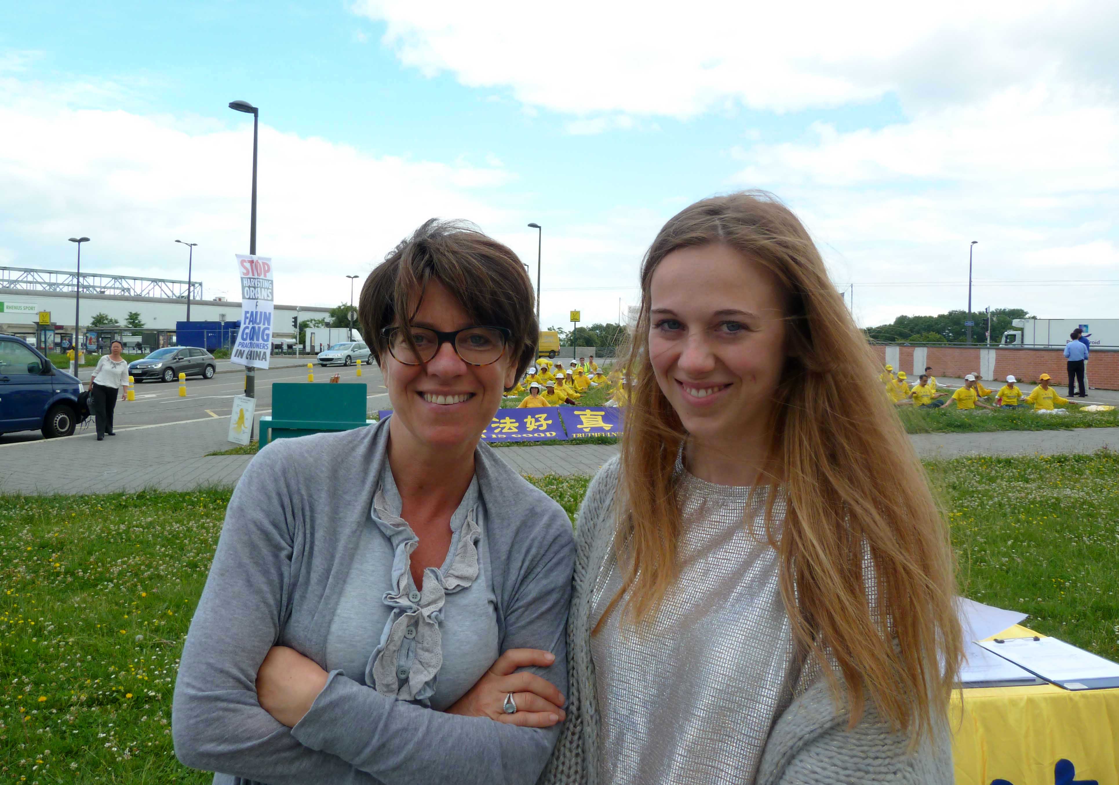 ![]() 图7:来自比利时的英格利特(左)和史黛凡妮(右)是母女,她们签字支持法轮功学员的诉求。 |