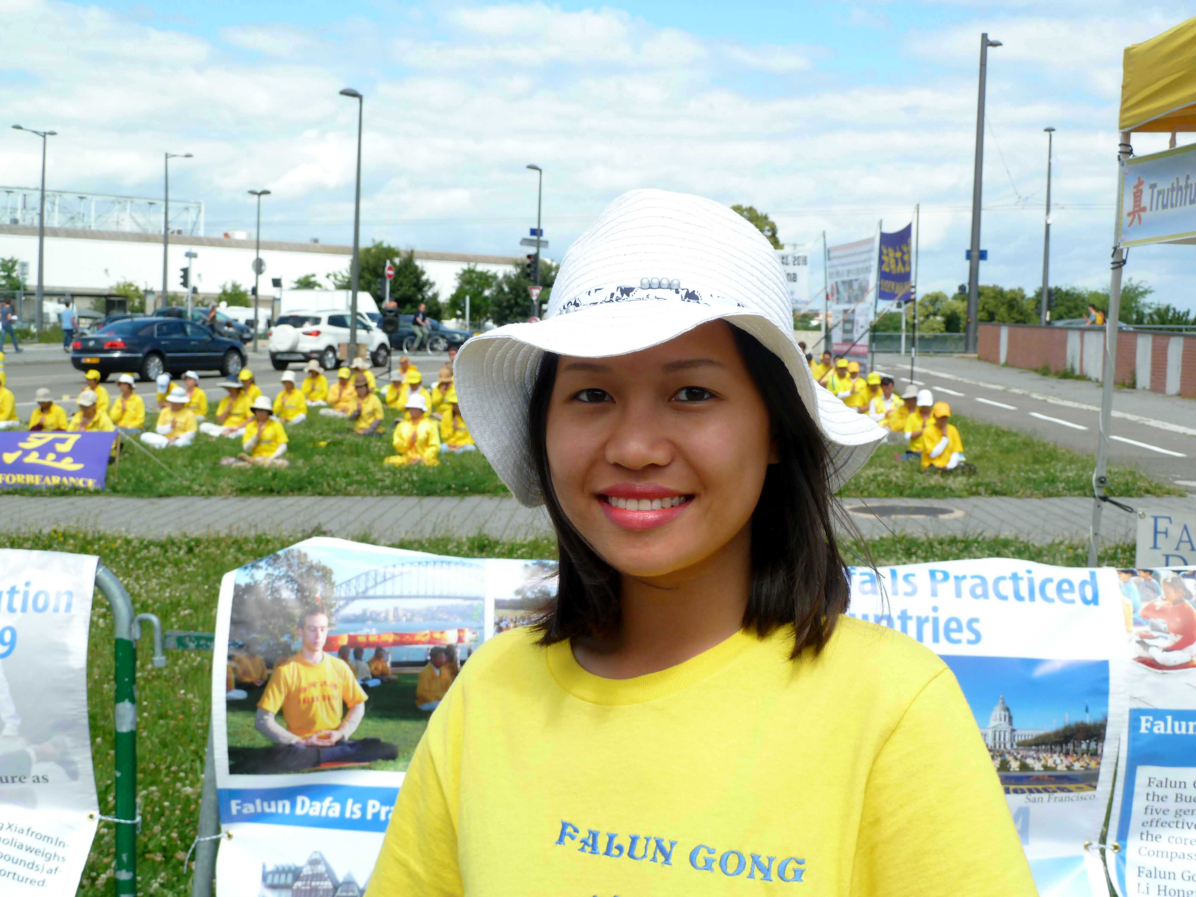二十七岁的法轮功学员努恩(Nhung)来自德国,她的父母是越南人,四年前努恩在互联网上偶然间看到了法轮功教功录像,从此和先生一起走入修炼大门。她说:“以前我的脾气很急,容易发火,现在温和多了。以前经常和先生吵架,现在先生让我生气时,我知道要做到真善忍,找自己不对的地方,而且要尽量带着平静的心态和先生交流。所以很多矛盾都化解了。”