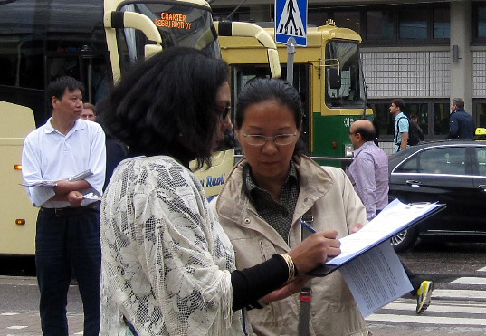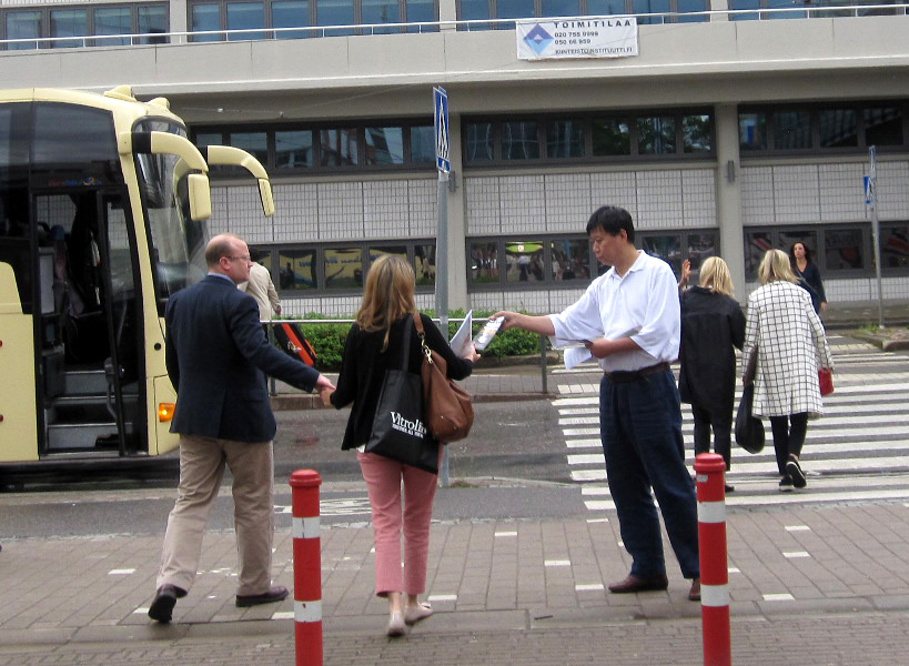 为了让这些专业人士了解中共活摘法轮功学员器官的罪行,部分芬兰法轮功学员在此期间来到会场外举办征签活动。