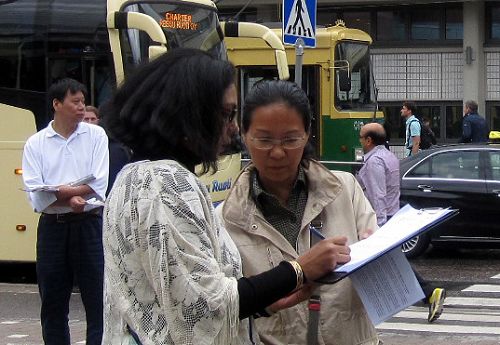 ![]() 图4-5:前来参加Eshere国际年会的与会者了解真相后,在“DAFOH(医生反对强制摘取器官组织)”的征签表上签名支持。 |