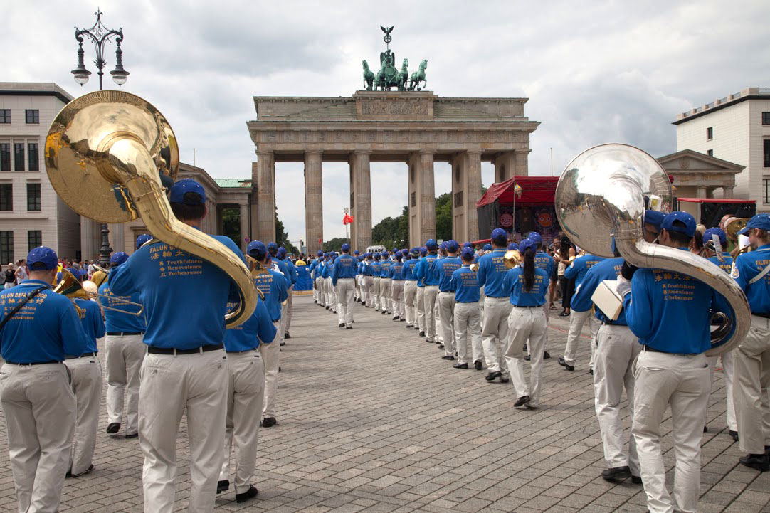 ![]() 法轮功学员从菩提树下大街走来,正准备穿越柏林地标建筑布兰登堡门,天国乐团打头阵。这一带被称作“柏林的心脏” |