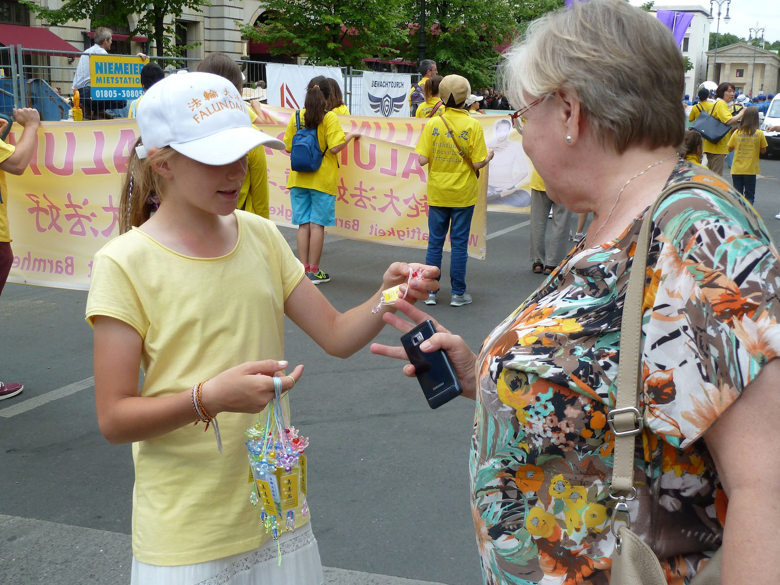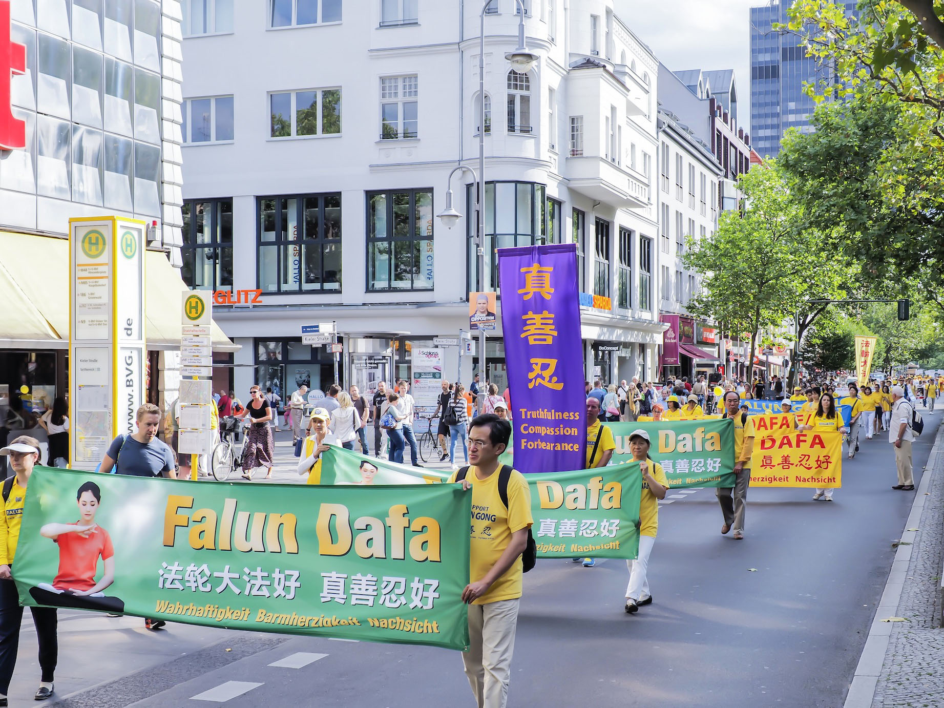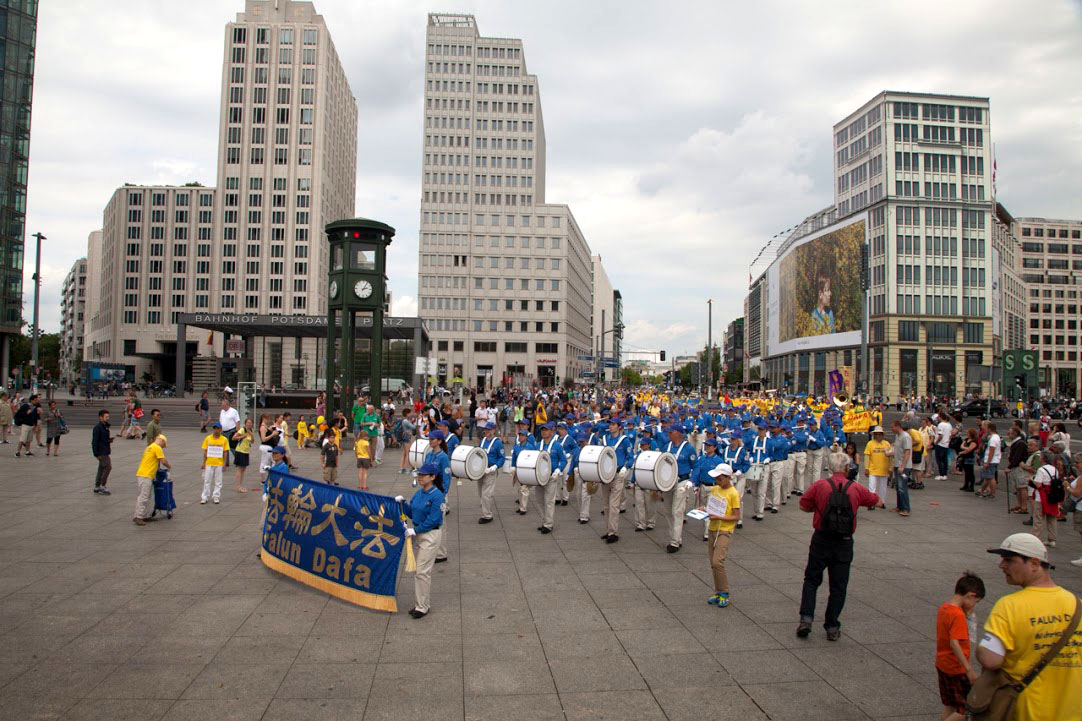 三位曾经在中国劳教所中被迫害的法轮功学员亲口讲述了他们是如何受迫害的,几十位法轮功学员不间断地展示功法。下午三点半,西柏林的游行结束。